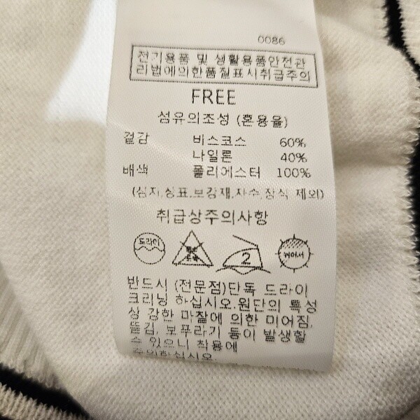 | 1. 제품 소재 (섬유의 조성 또는 혼용률을 백분율로 표시, 기능성인 경우 성적서 또는 허가서) | 겉감 - 비스코스60%, 나일론40% 배색 - 폴리에스터100% |