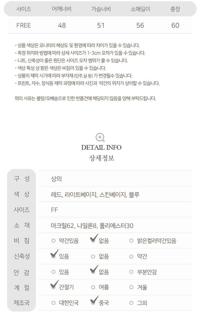 • 처음 배송된 상품상태와 다를 경우(세탁/착용 후 외출하신 경우) 반품이 불가합니다.