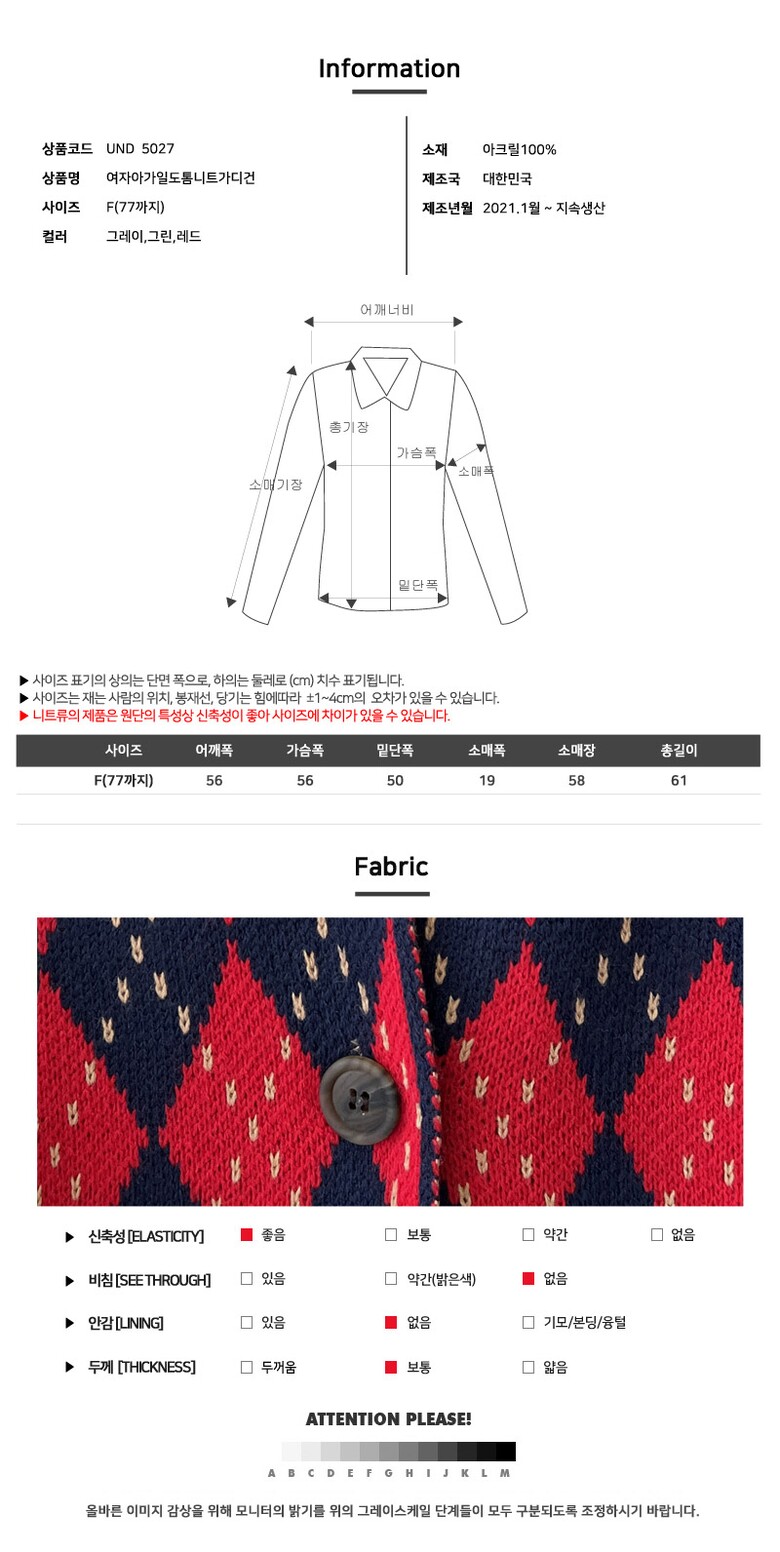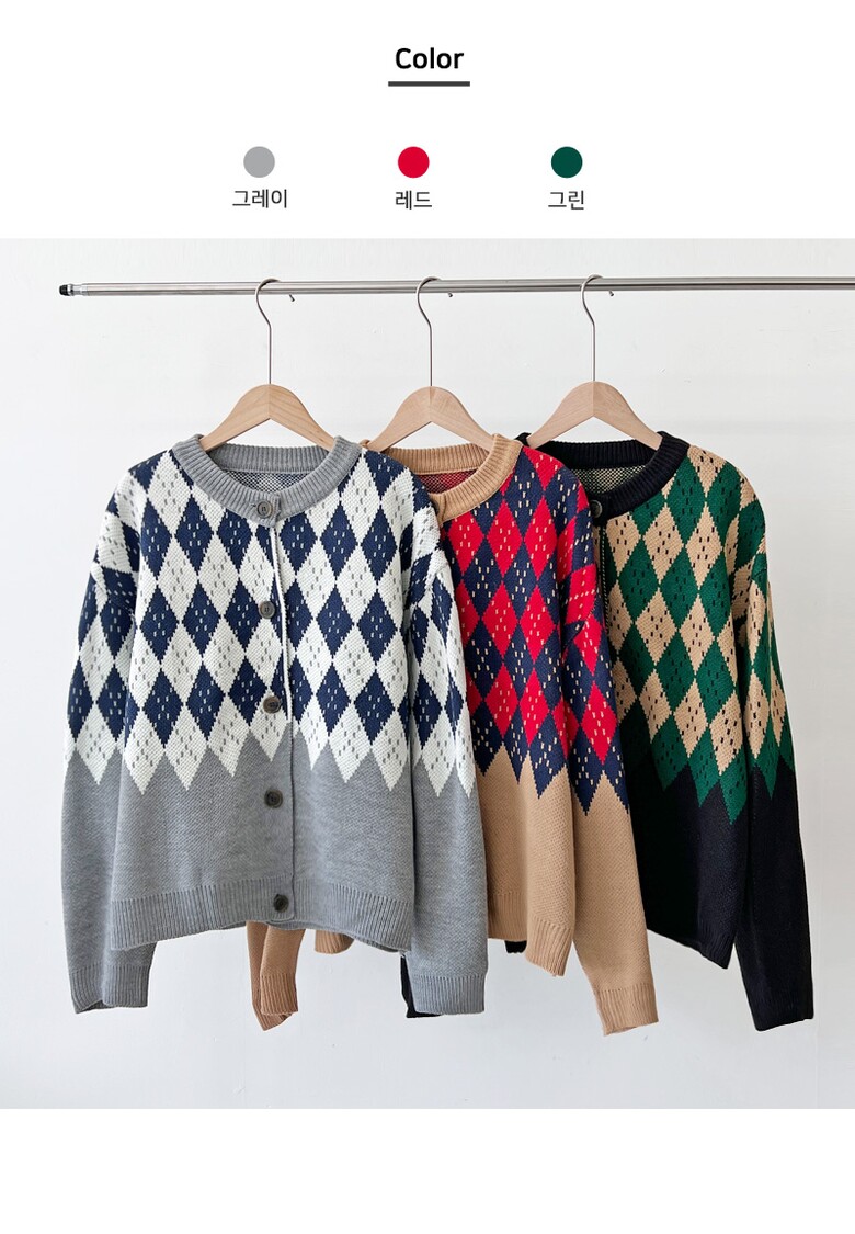 블레오 여성 가을 겨울 루즈핏 아가일 라운드 긴팔 니트 가디건