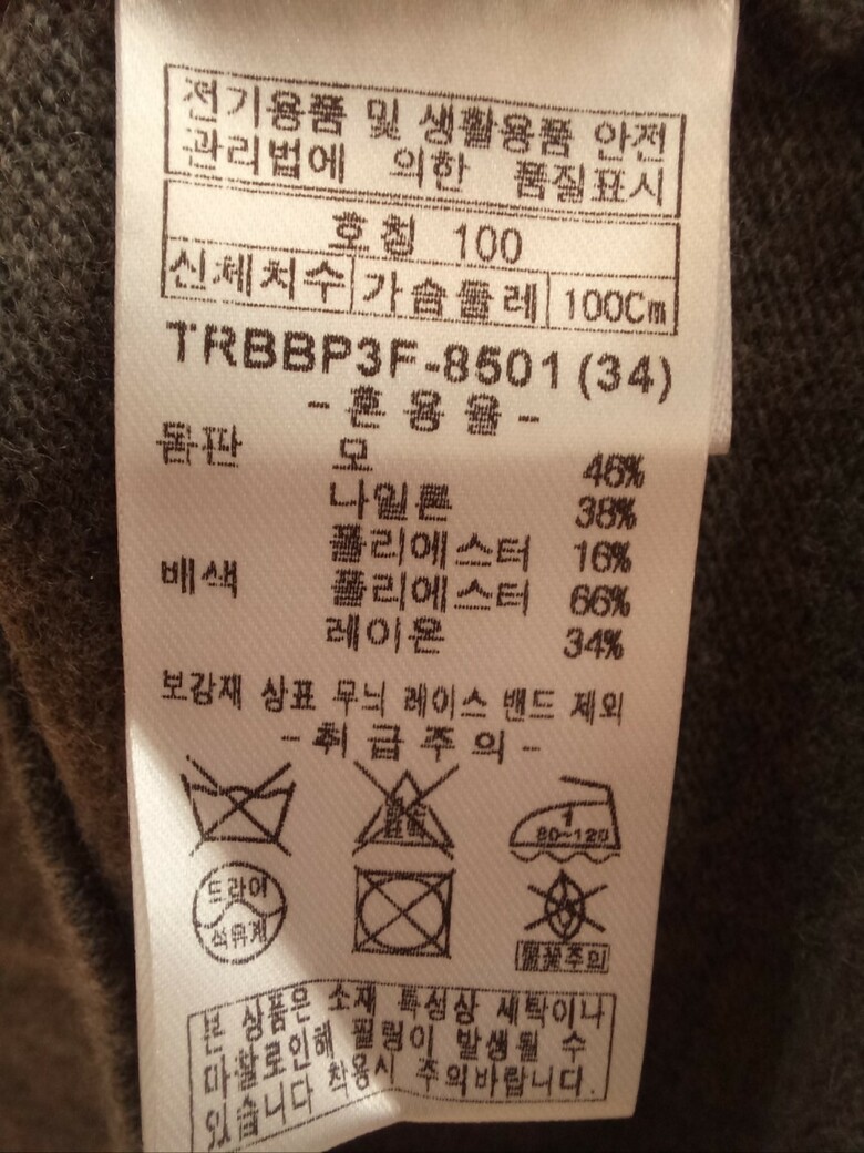 | 1. 제품 소재 (섬유의 조성 또는 혼용률을 백분율로 표시, 기능성인 경우 성적서 또는 허가서) | 모 46%, 나일론 38% / 배색:폴리에스테르 66%, 레이온 34%, 레이스 |
