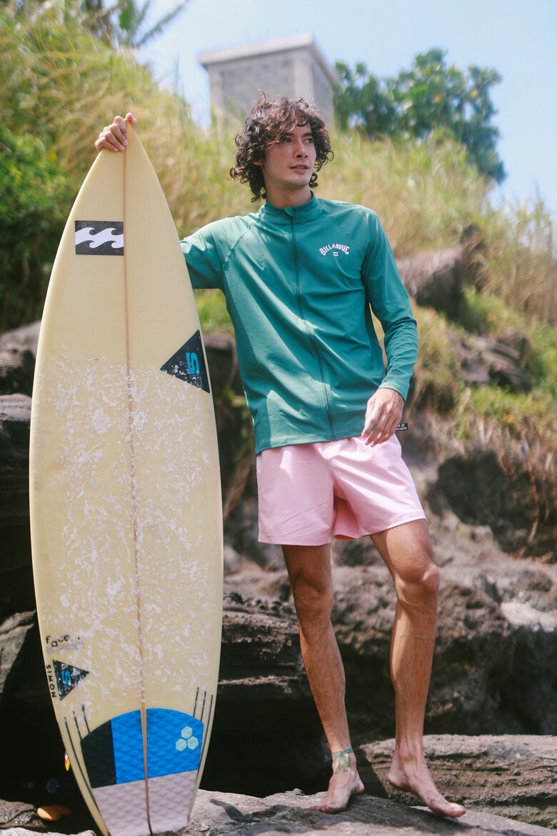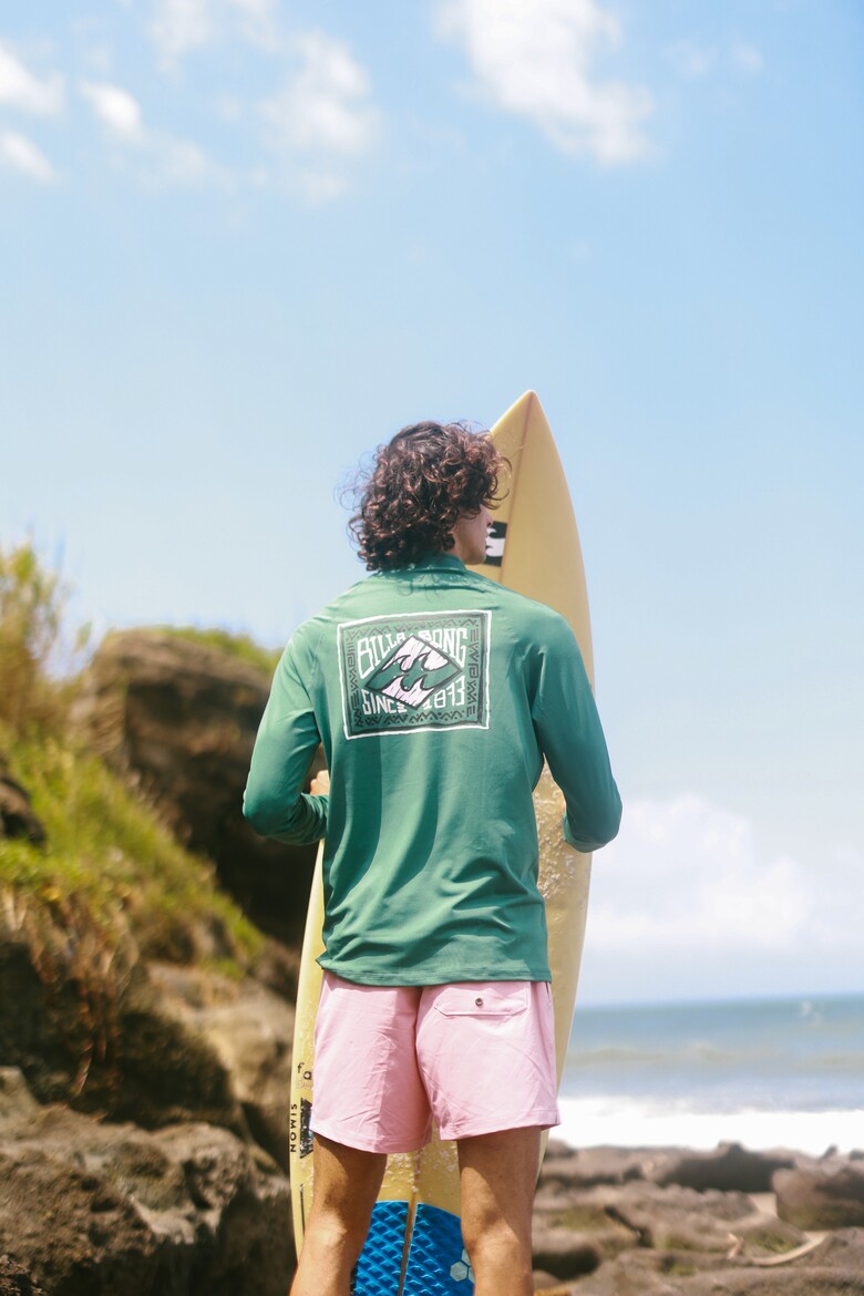 레귤러 핏보다 여유 있는 루즈 핏 긴팔 집업 래쉬가드로 편안한 착용감과 후면 그래픽 프린트 포인트가 특징입니다