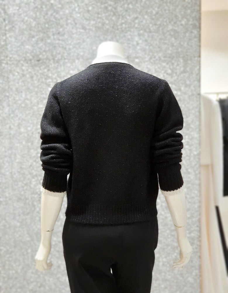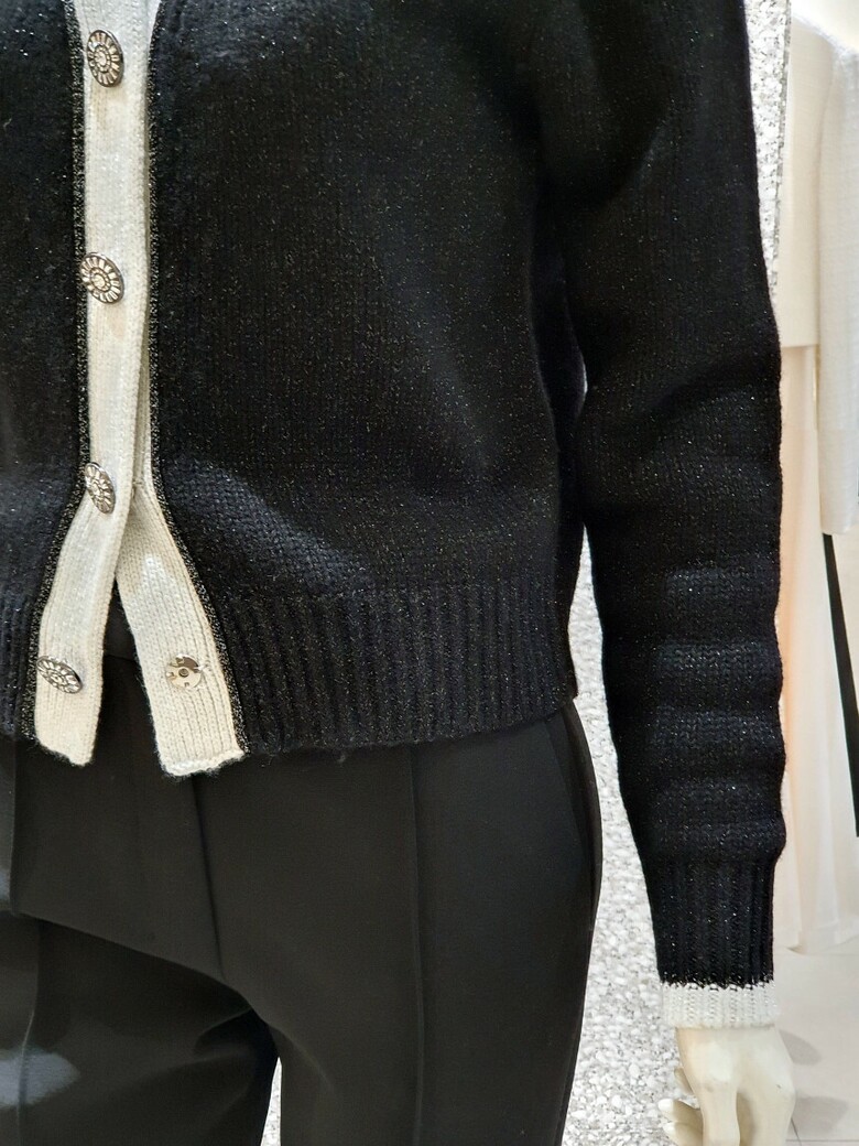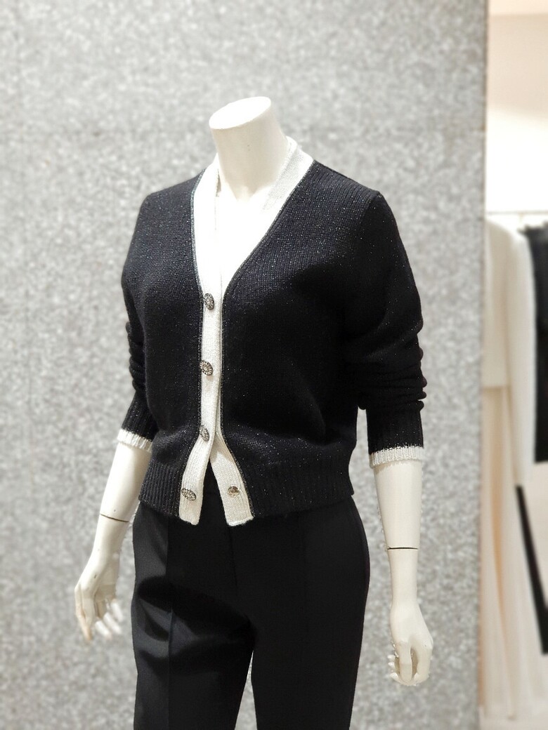 네크라인에서 여밈 라인으로 이어지는 배색 디테일로