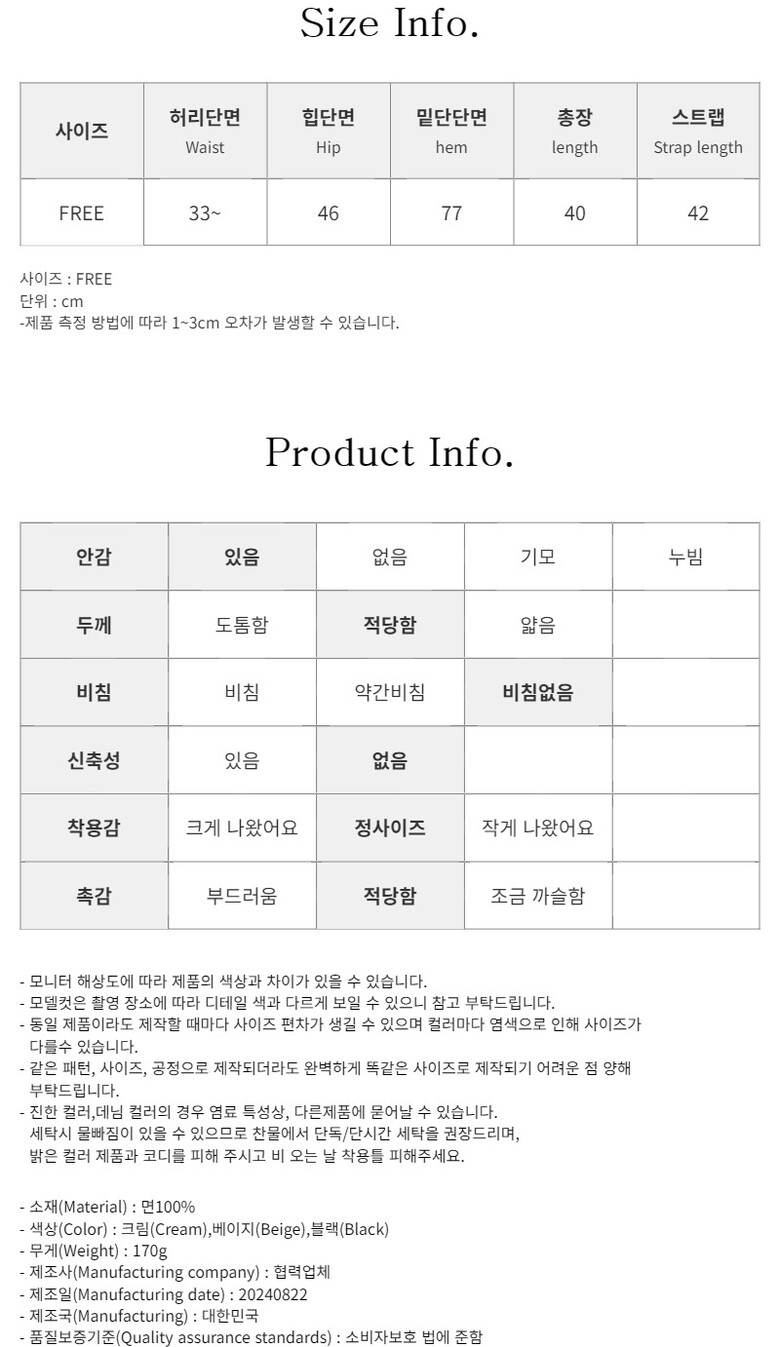허리단면 / 힙단면 / 밑단단면 / 총장 / 스트랩 (FREE)33~ / 46 / 77 / 40 / 42