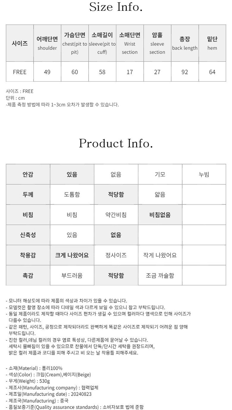 - COLOR(색상) : 크림(Cream),베이지(Beige)