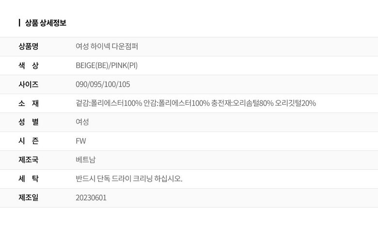 | 1. 제품 소재 (섬유의 조성 또는 혼용률을 백분율로 표시, 기능성인 경우 성적서 또는 허가서) | 겉감:폴리에스터100% 안감:폴리에스터100% 충전재:오리솜털80% 오리깃털20% |