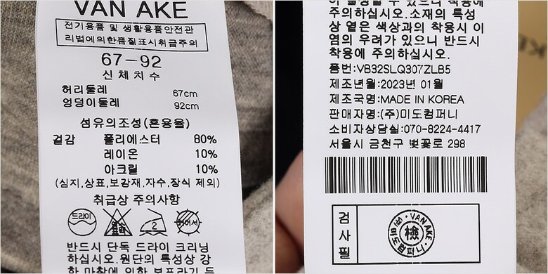 | 1. 제품 소재 (섬유의 조성 또는 혼용률을 백분율로 표시, 기능성인 경우 성적서 또는 허가서) | 겉감-폴리에스터80% 레이온10% 아크릴10% |
