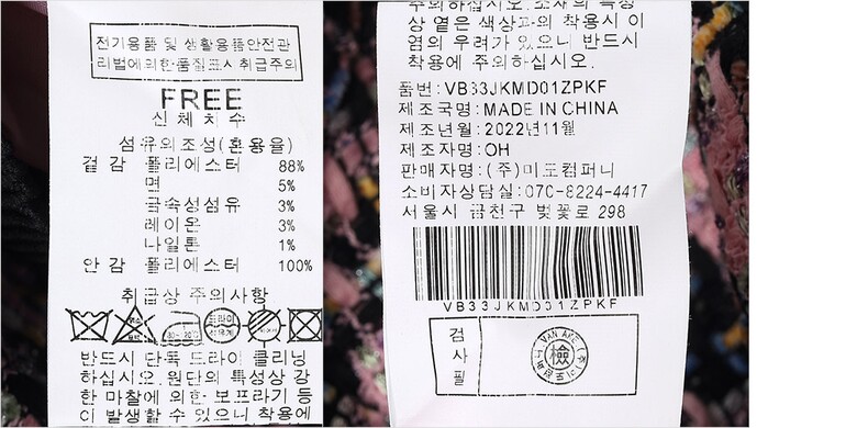 | 1. 제품 소재 (섬유의 조성 또는 혼용률을 백분율로 표시, 기능성인 경우 성적서 또는 허가서) | 겉감-면5% 폴리에스터88% 나일론1% 레이온3% 금속성섬유3% 안감-폴리에스터100% |