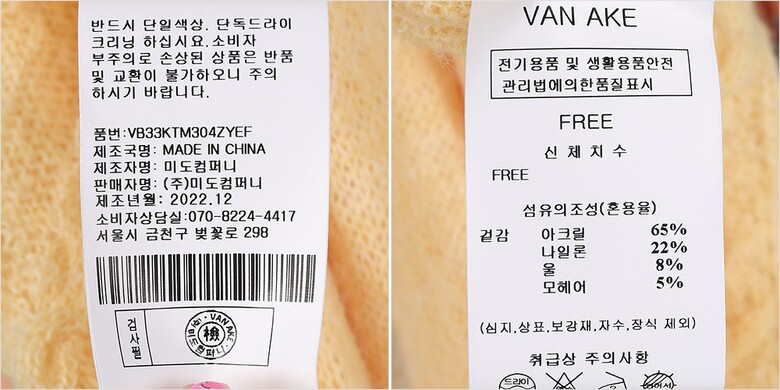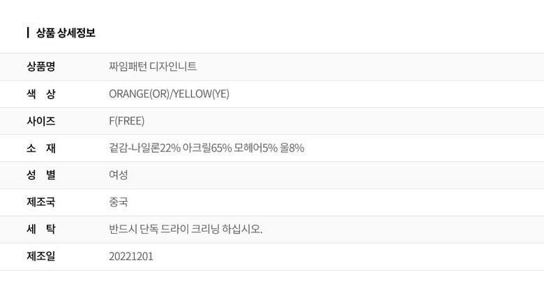 | 1. 제품 소재 (섬유의 조성 또는 혼용률을 백분율로 표시, 기능성인 경우 성적서 또는 허가서) | 겉감-나일론22% 아크릴65% 모헤어5% 울8% |