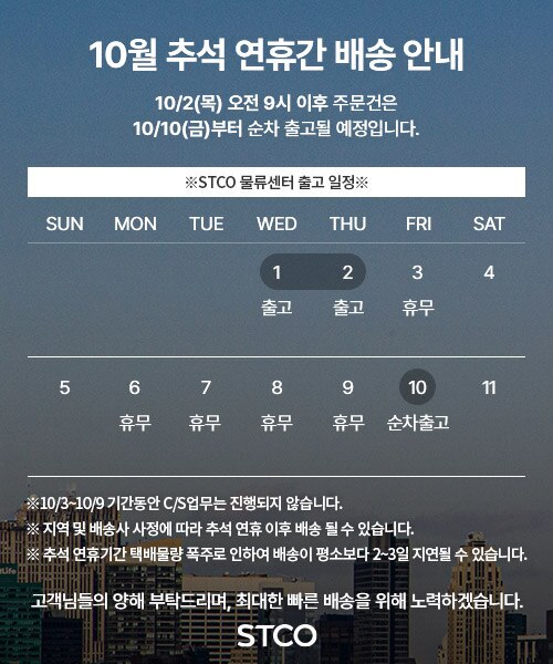 • 상품의 재고상황에 따라 배송 기일이 다소 지연 되거나, 품절로 인해 취소 될 수 있습니다.