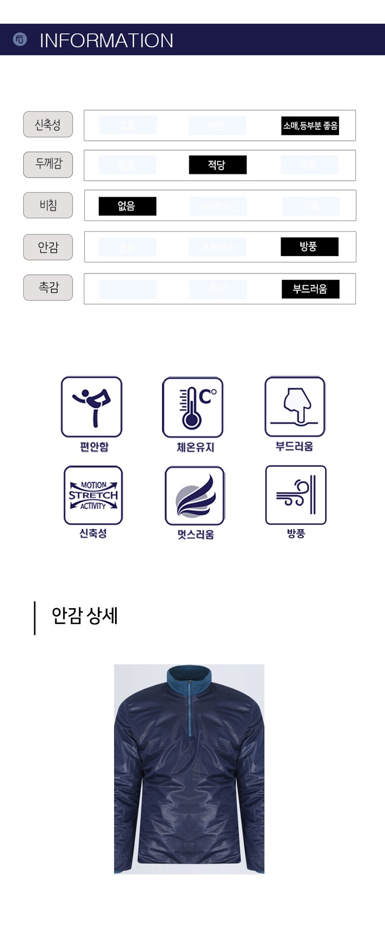 | 1. 제품 소재 (섬유의 조성 또는 혼용률을 백분율로 표시, 기능성인 경우 성적서 또는 허가서) | 상세설명참고 |