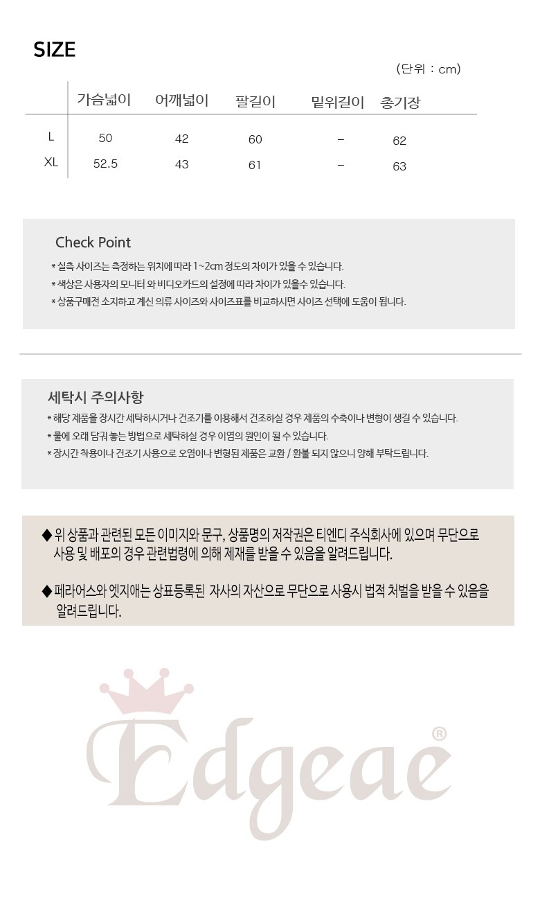 • 처음 배송된 상품상태와 다를 경우(세탁/착용 후 외출하신 경우) 반품이 불가합니다.