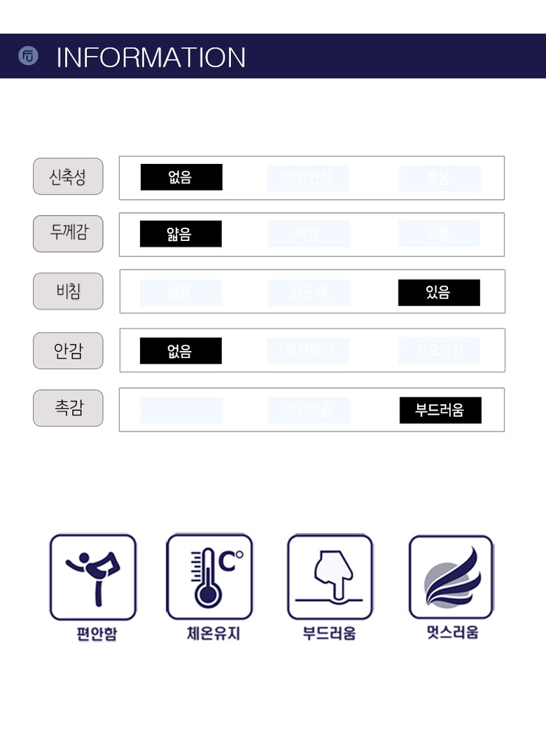 | 1. 제품 소재 (섬유의 조성 또는 혼용률을 백분율로 표시, 기능성인 경우 성적서 또는 허가서) | 상세설명참고 |