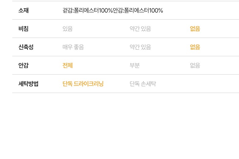 | 1. 제품 소재 (섬유의 조성 또는 혼용률을 백분율로 표시, 기능성인 경우 성적서 또는 허가서) | 겉감:폴리에스터100%안감:폴리에스터100% |