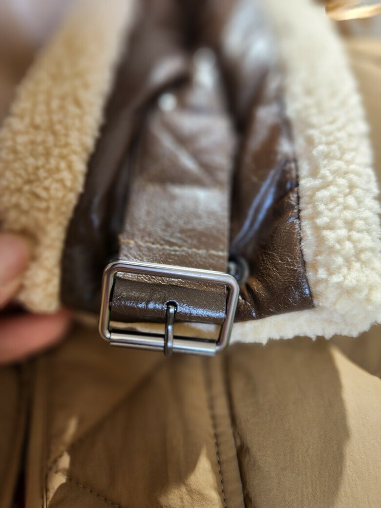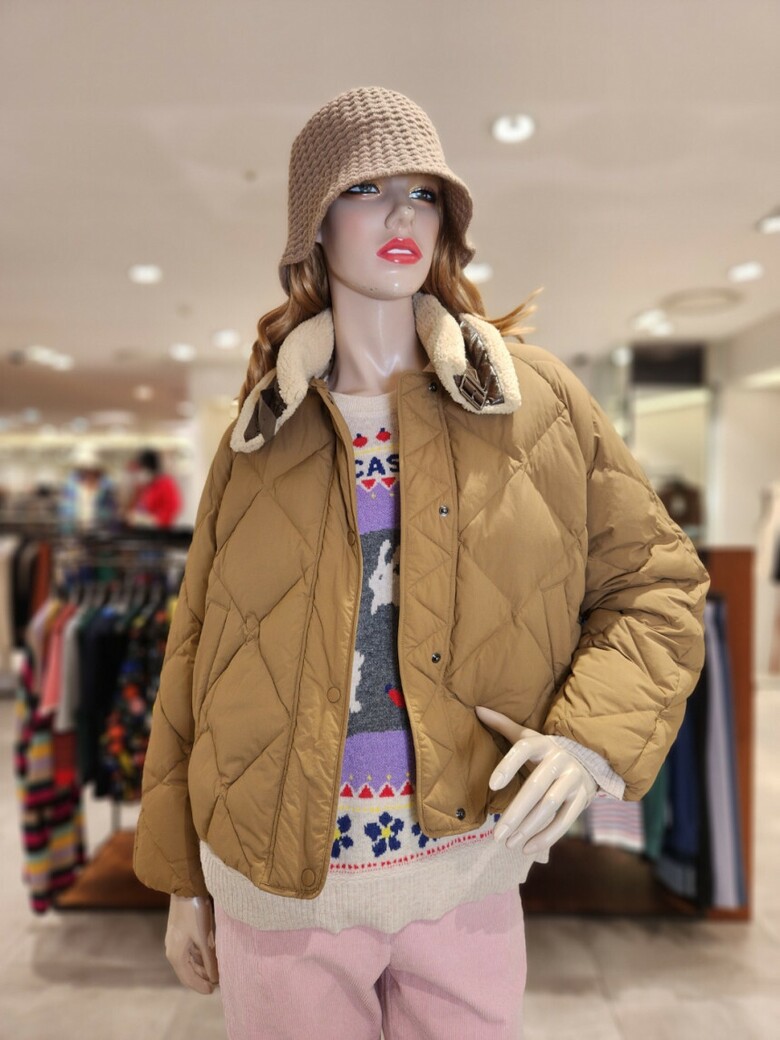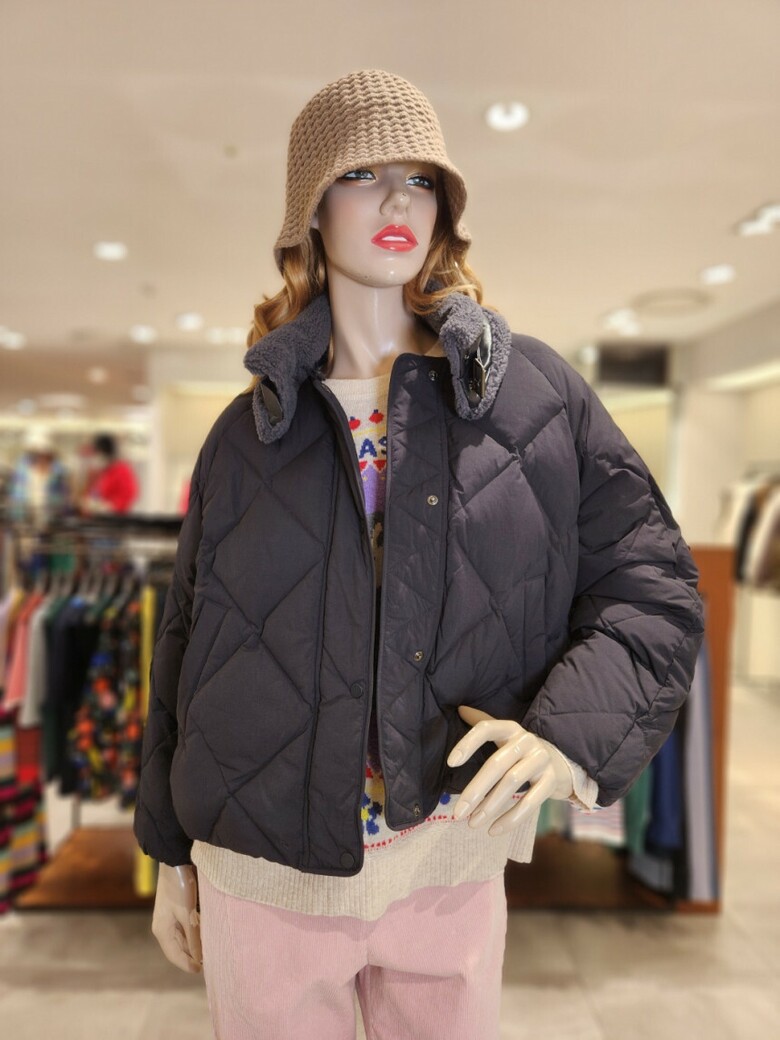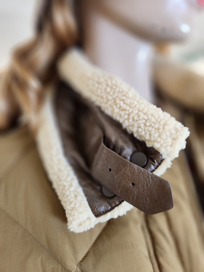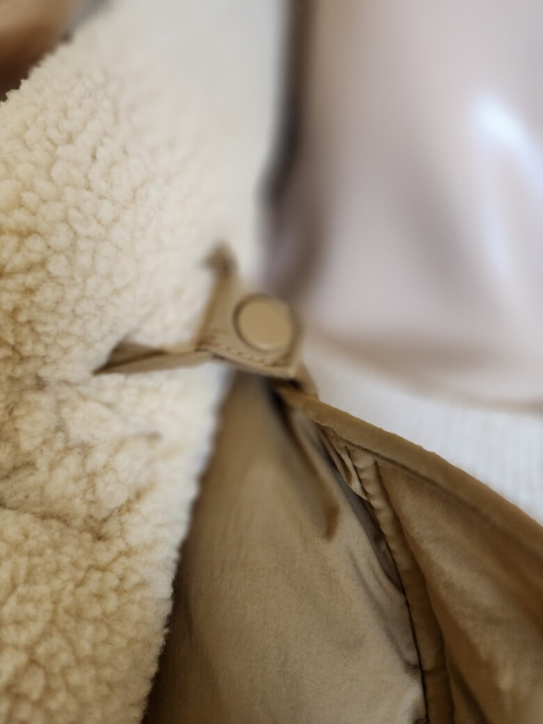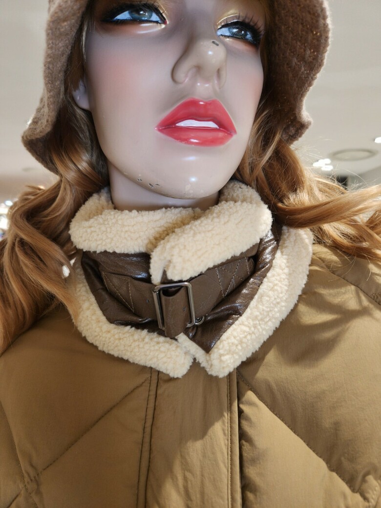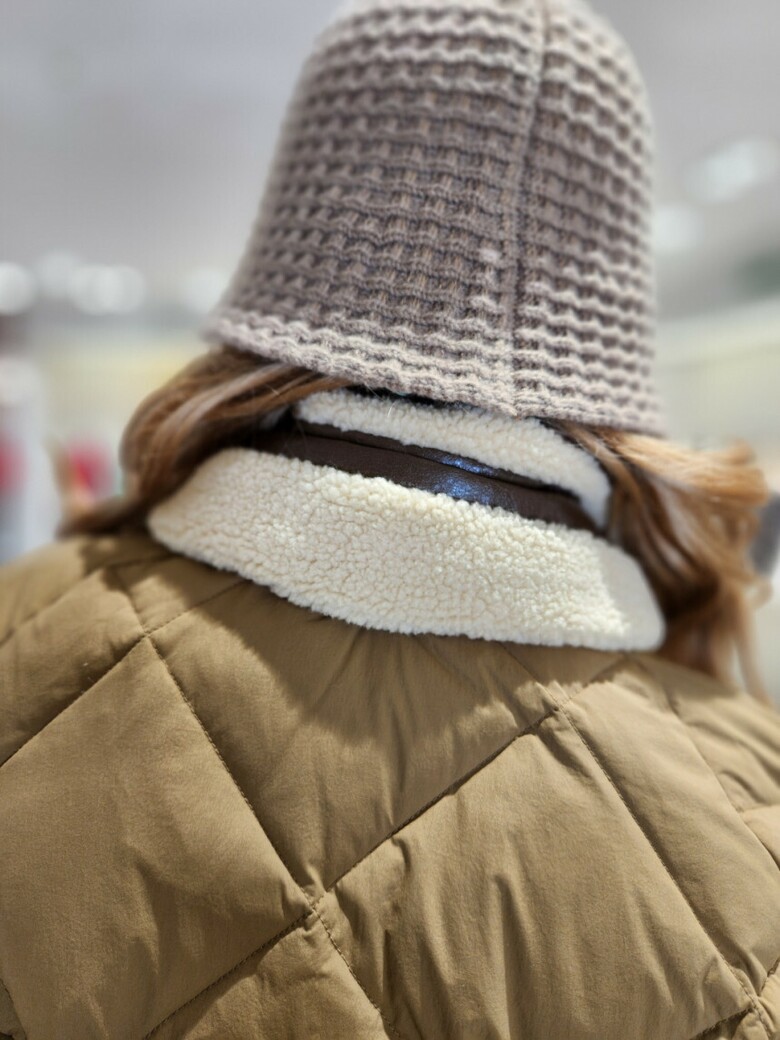 하이넥 네크라인의 부클소재 워머장식으로