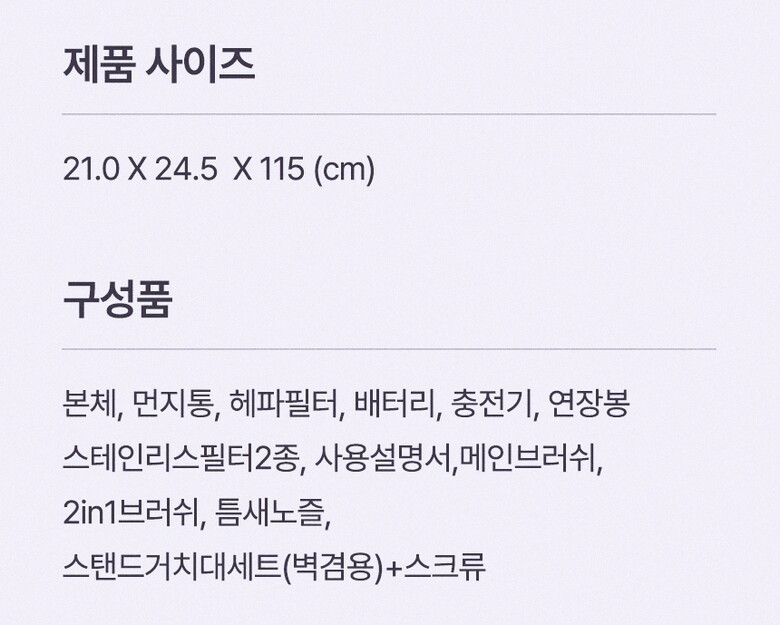 6. 크기/무게(폭x높이x깊이)(cm) 무선청소기: 박스크기: 685 x 250 x 185(mm) / 제품중량: 2.5kg, 박스중량: 5.1kg