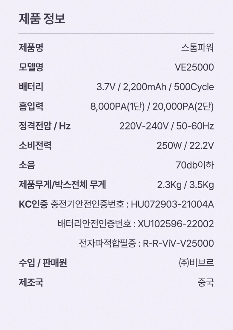 1. 모델명(품번) 비브르 스톰파워 VE25000