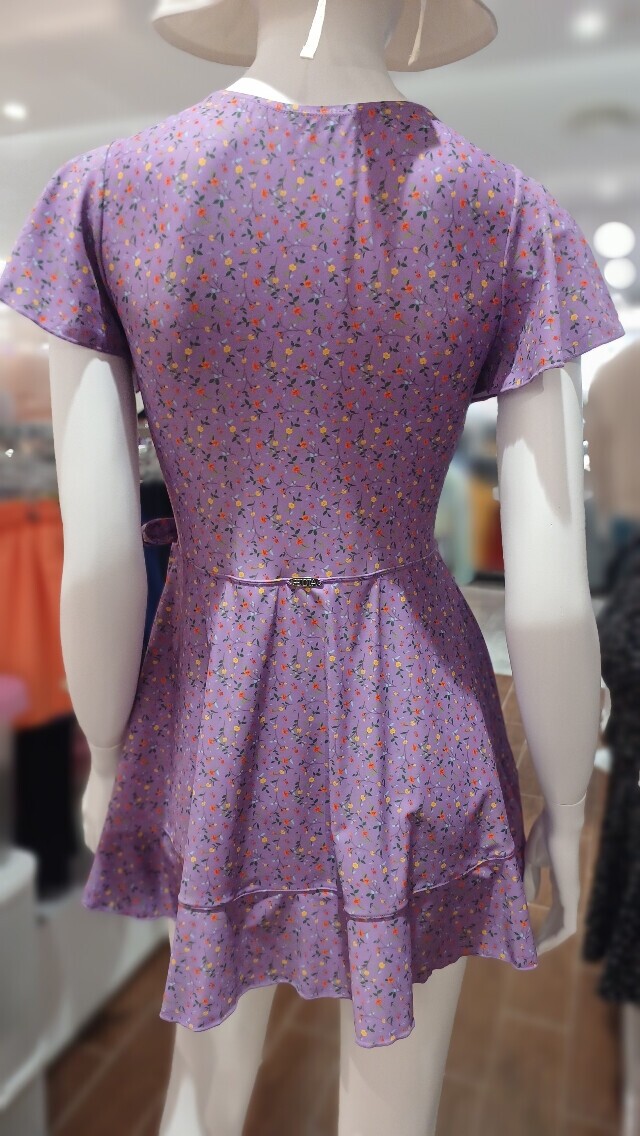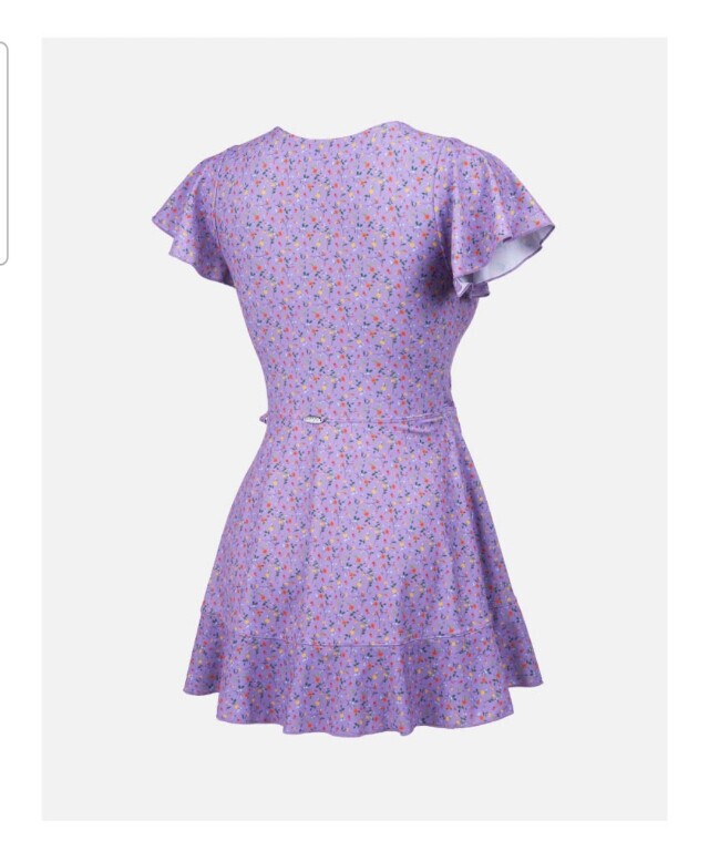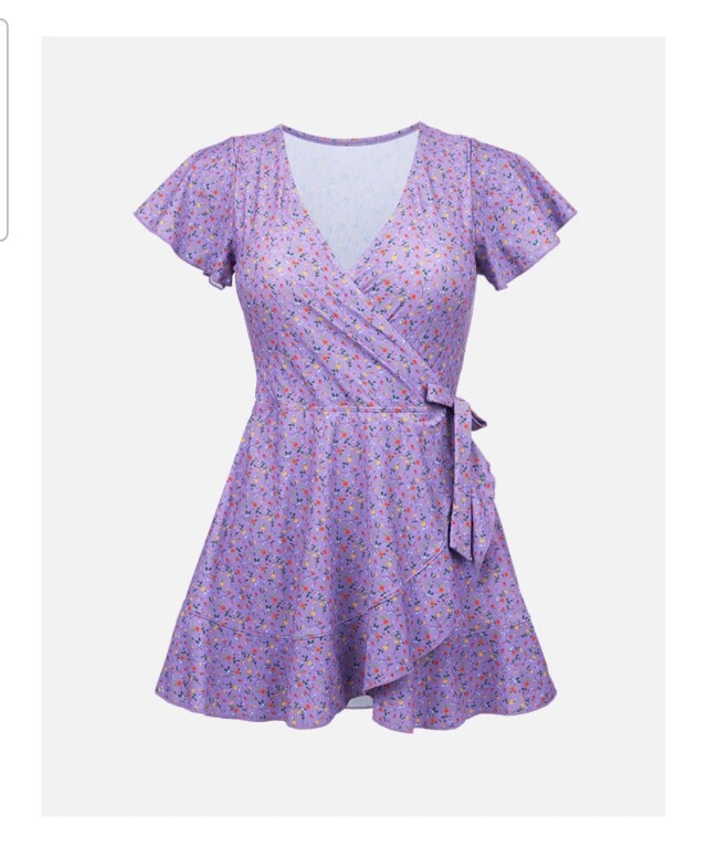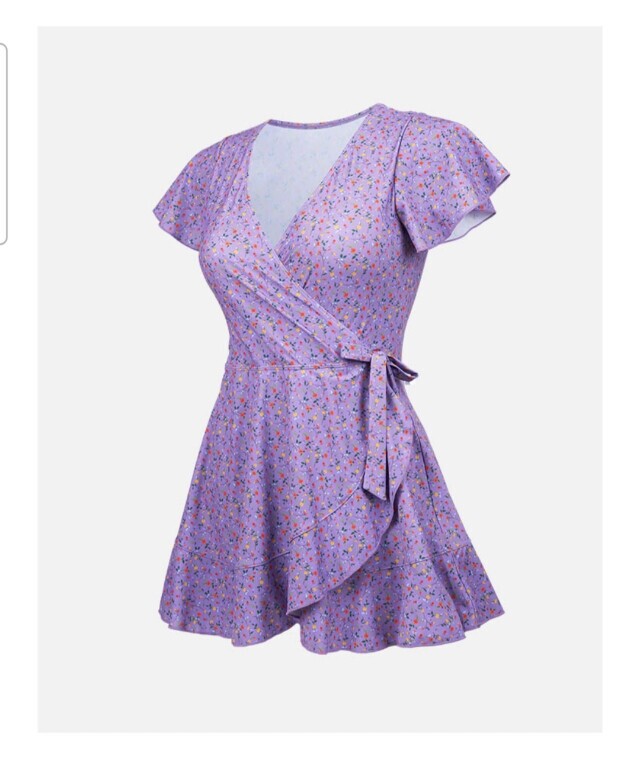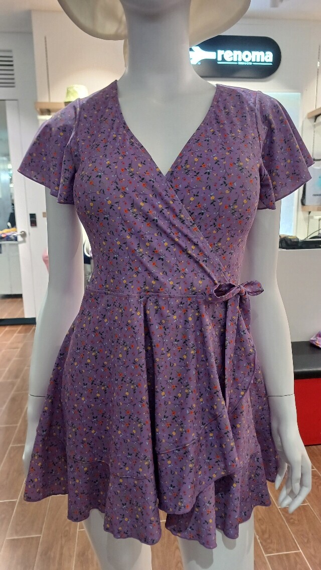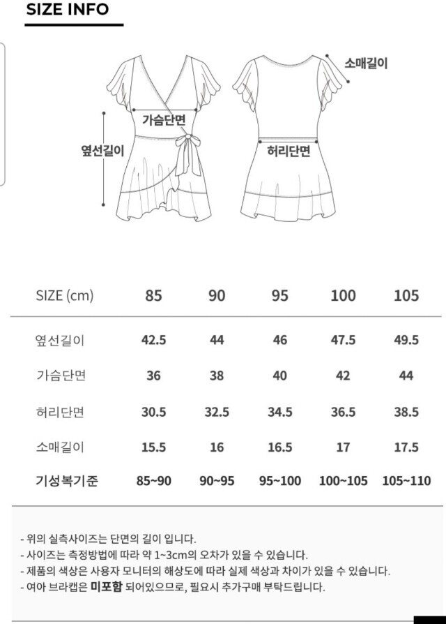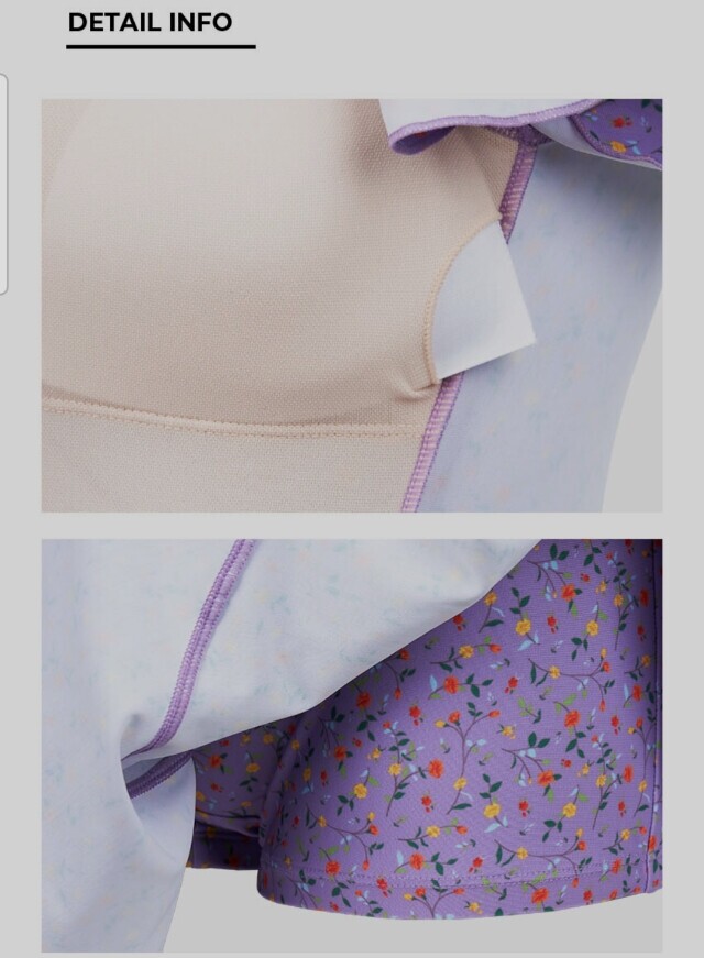 어깨는 프릴 디테일로 여성스러우며 팔뚝살 커버 가능하고 사각 이너팬츠로 노출이 부담스럽지 않게 체형커버가 되는 랩 원피스수영복입니다.