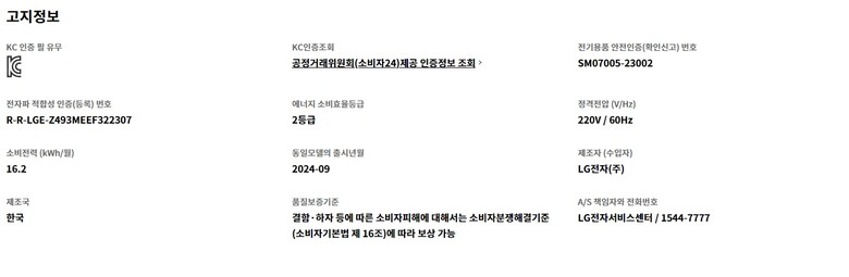 3. 전기용품 안전인증 필 유/무 | KC SM07005-23002, R-R-LGE-Z493MEEF322307 |