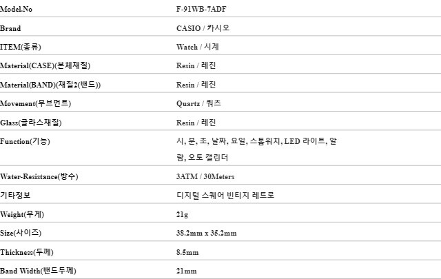 카시오 F-91WB-7ADF (F-91WB-7A) 디지털 스퀘어 빈티지 레트로 공용 우레탄시계