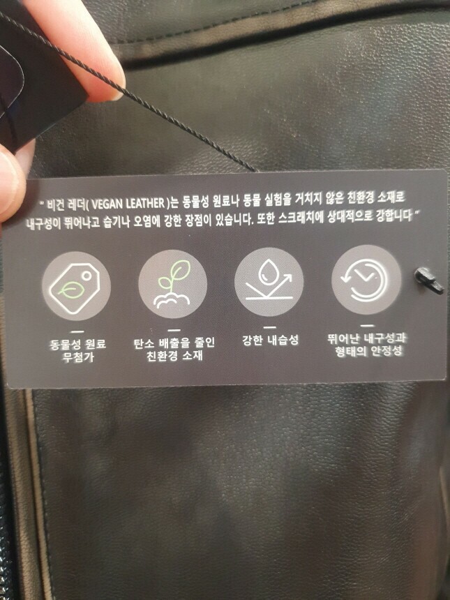 | 1. 제품 소재 (섬유의 조성 또는 혼용률을 백분율로 표시, 기능성인 경우 성적서 또는 허가서) | 겉감 : 인조가죽 (합성가죽) 100% 안감 : 폴리에스터 100% (심지,보 |