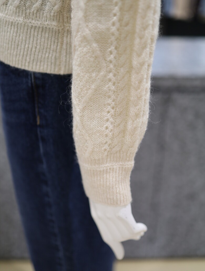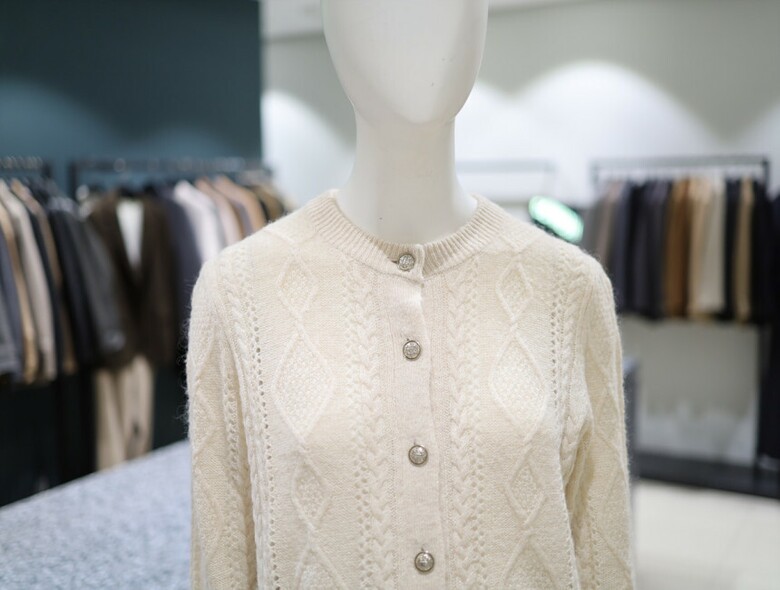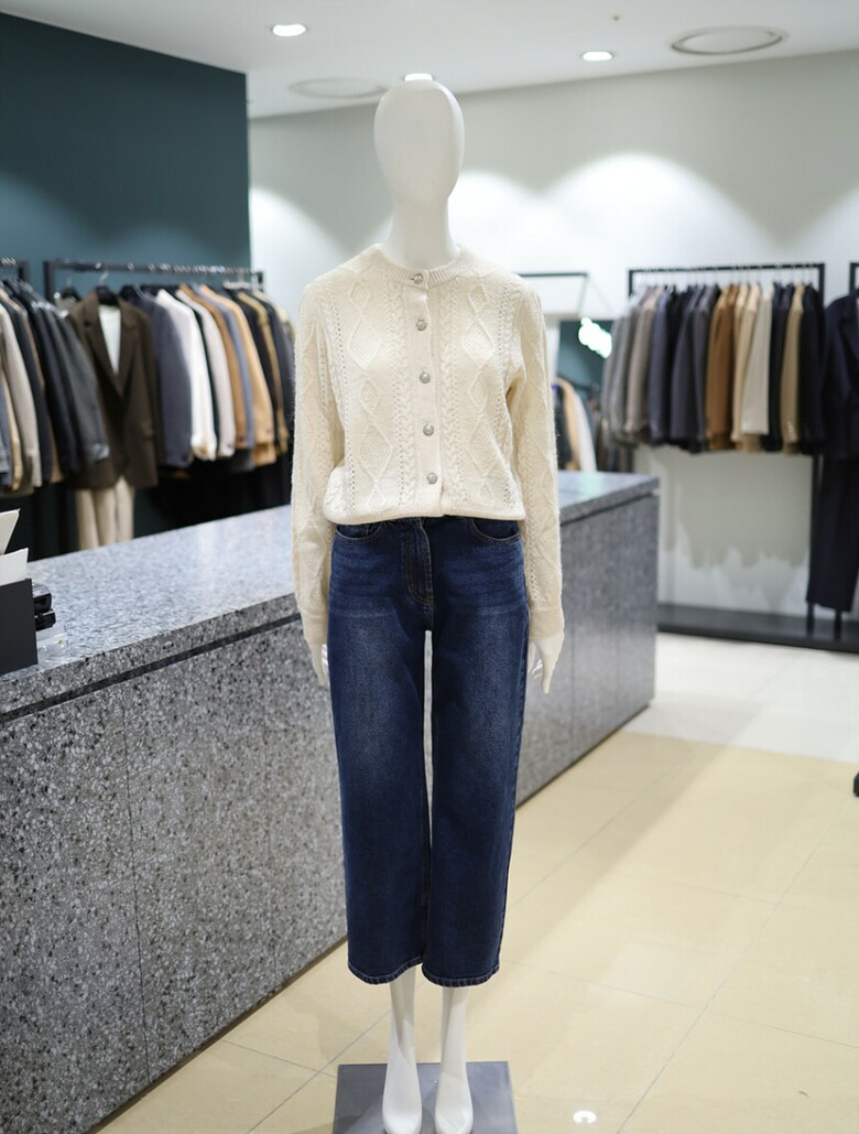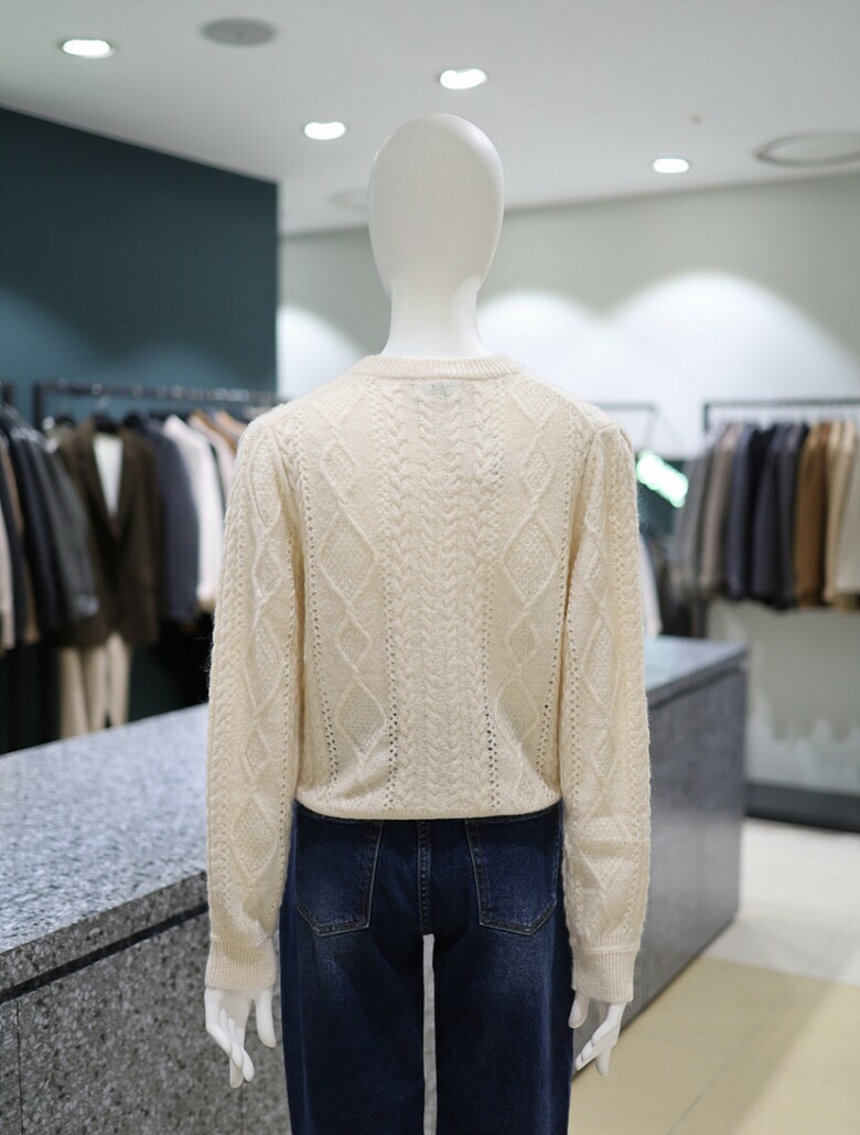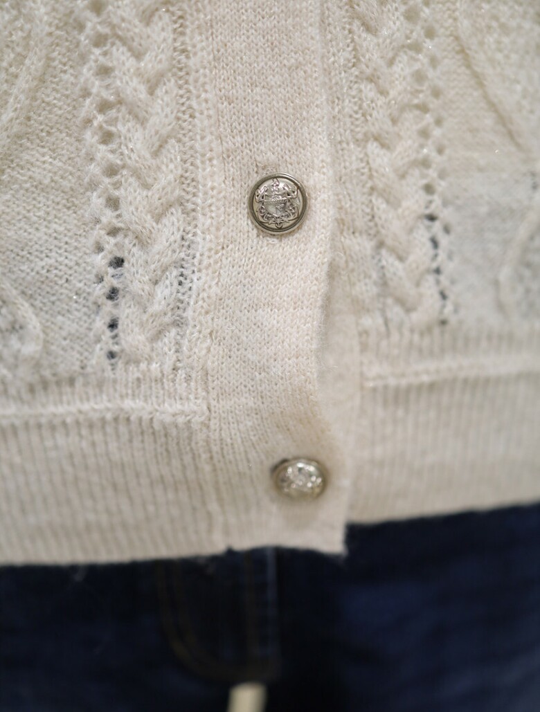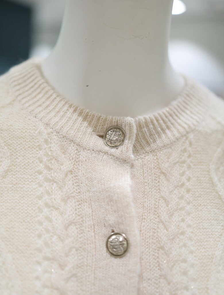 케이블 짜임의 니트에 앞면 골드 버튼으로 포인트를 더했습니다.