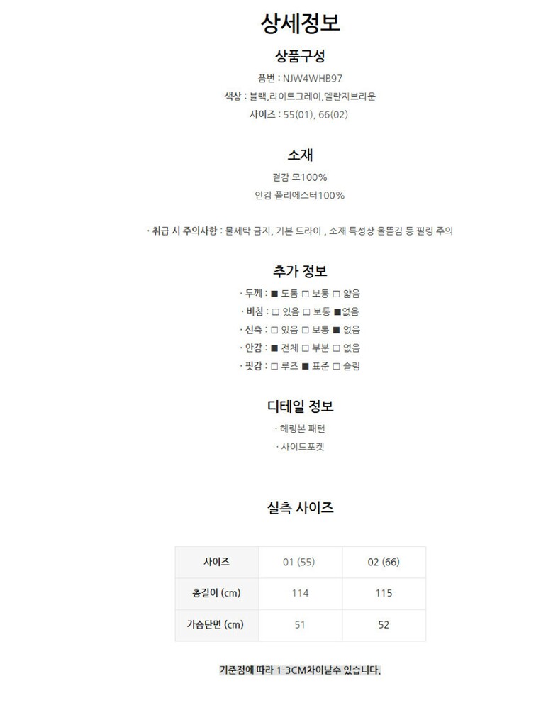 | 1. 제품 소재 (섬유의 조성 또는 혼용률을 백분율로 표시, 기능성인 경우 성적서 또는 허가서) | 겉감:모 100% / 안감:폴리에스테르 100% |