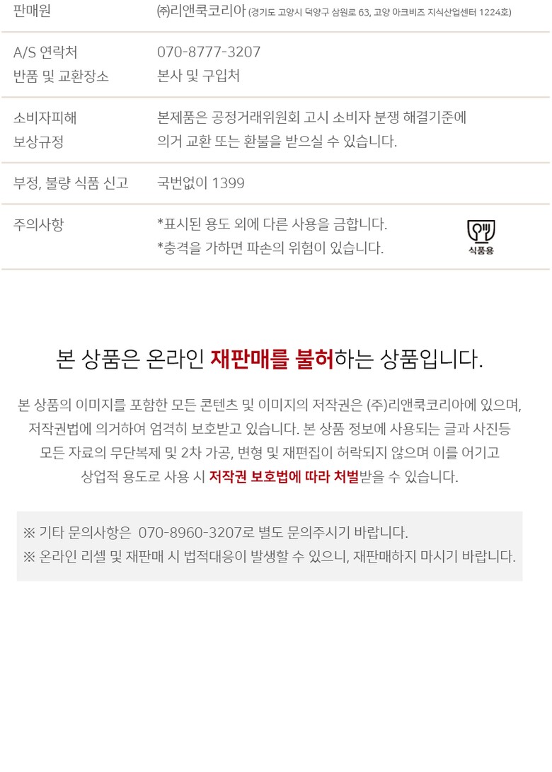 상품불량에 의한 반품, A/S, 품질보증 및 피해보상 등에 관한 사항은 소비자 분쟁해결기준(공정거래위원회 고시) 구매자가 미성년자인 경우에는 상품 구입시 법정대리인이 동의하지 아니하면 미성년자 본인 또는 법정대리인이 구매취소 할 수 있습니다. |