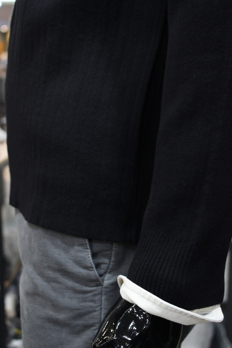 블랙컬러의 면혼방원단으로 적당히 무게감이 있으며 골지조직으로 스판성이 좋습니다