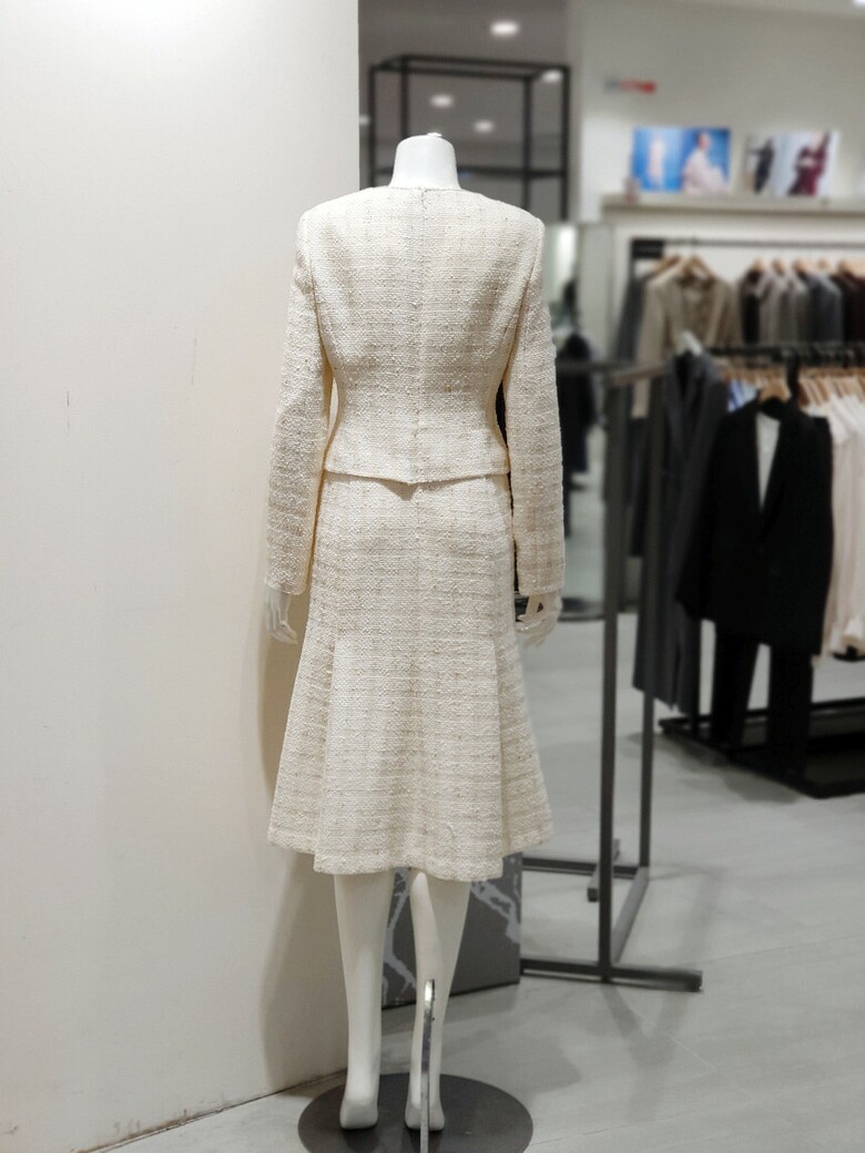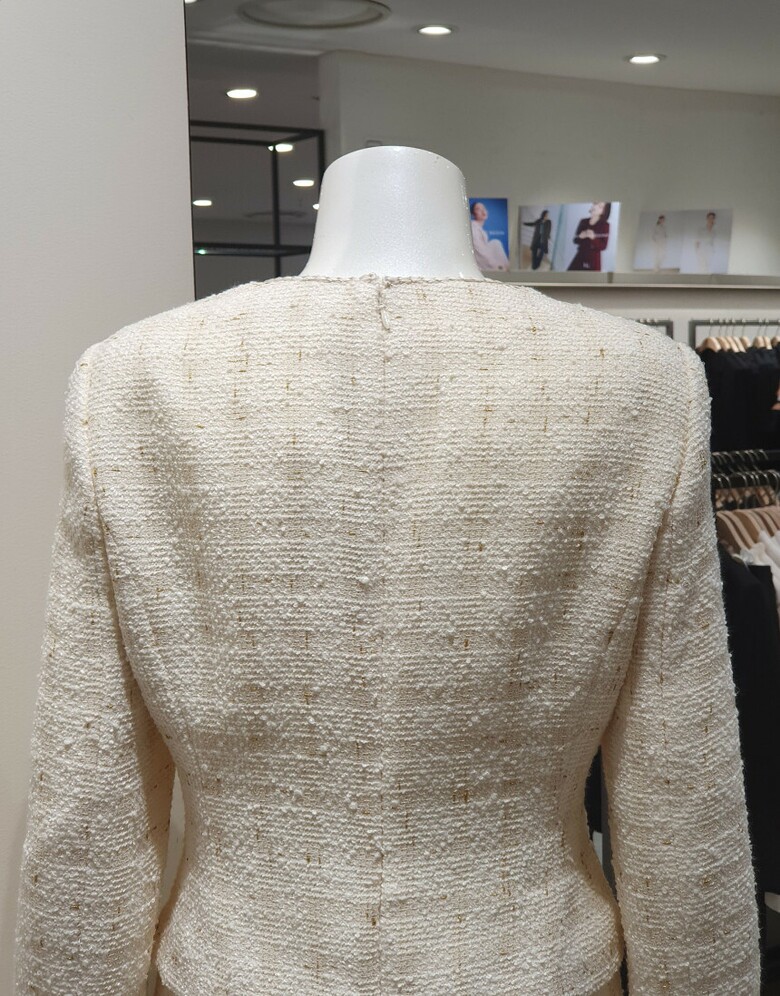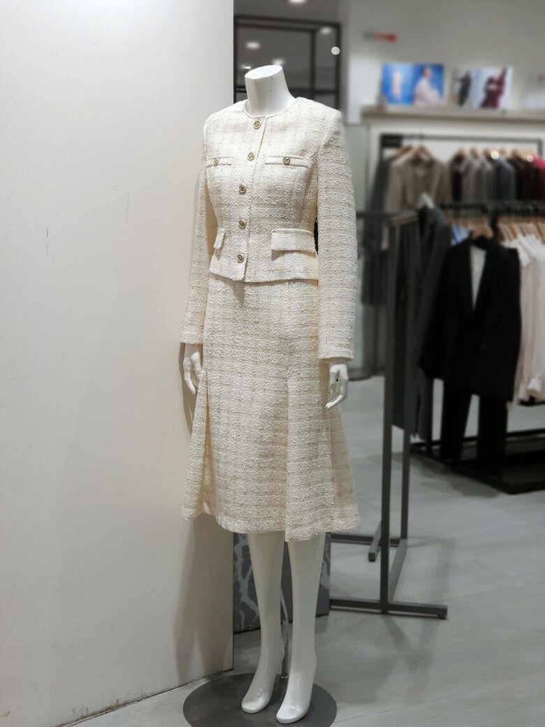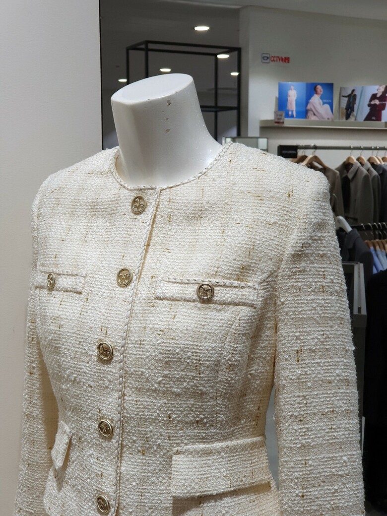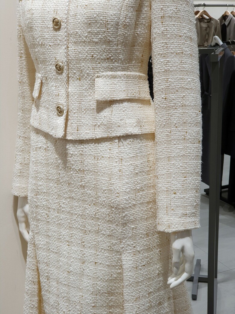 메탈 버튼이 프런트 포인트 장식된 트위드 원피스입니다.