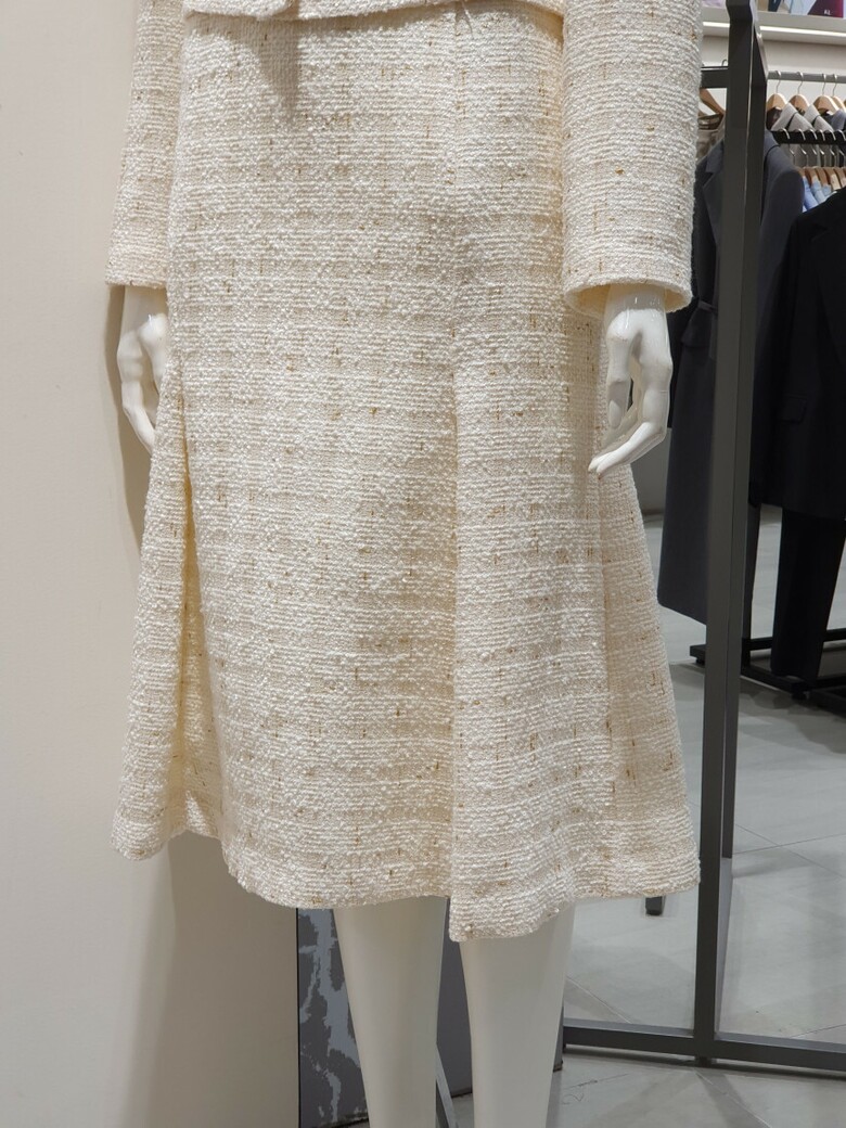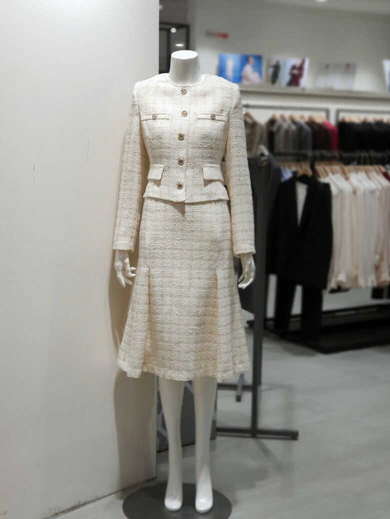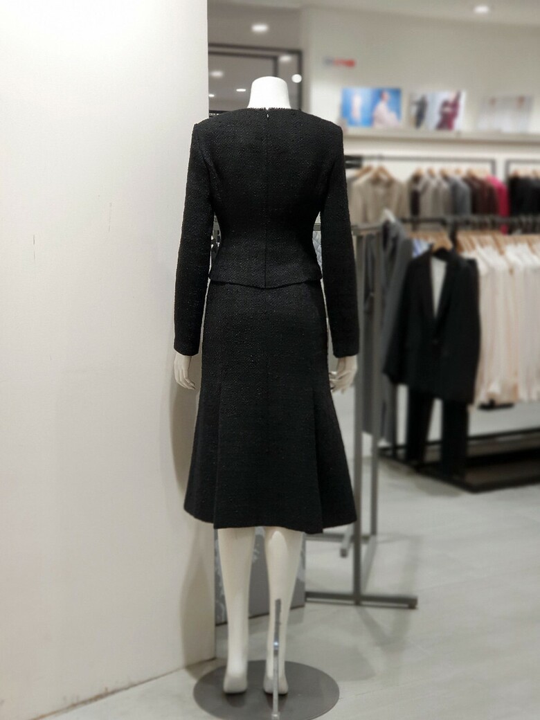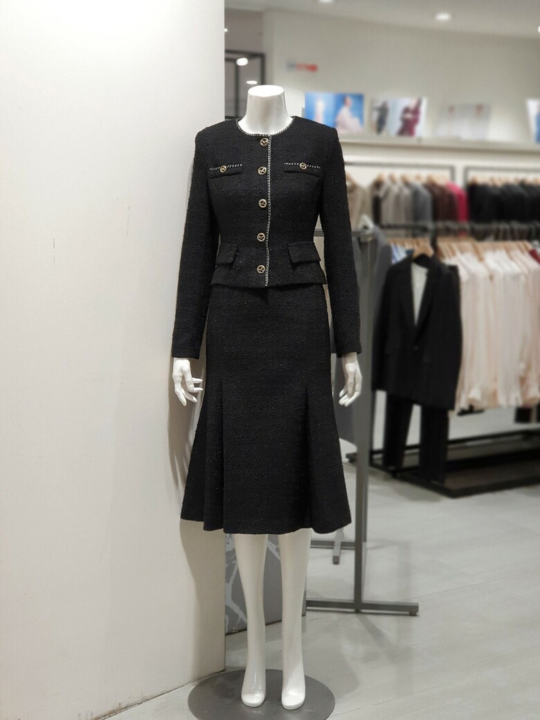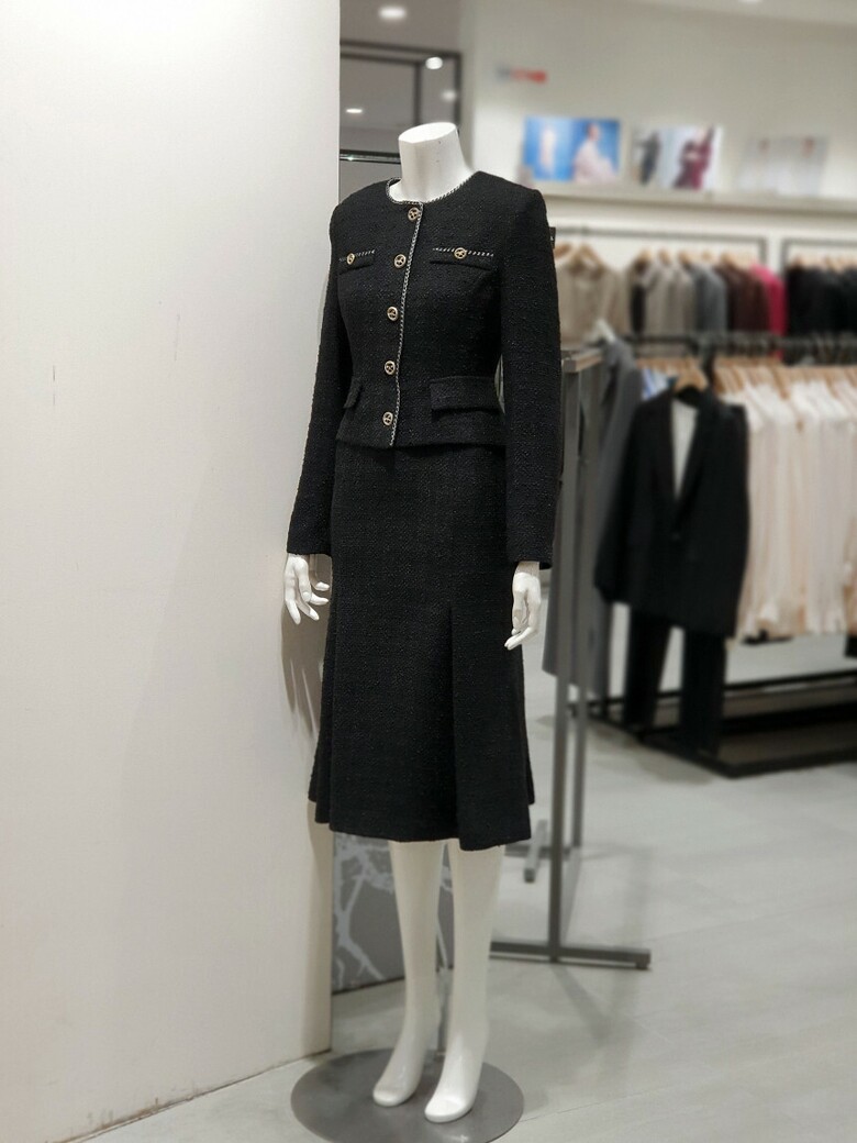 메탈 버튼이 프런트 포인트 장식된 트위드 원피스입니다.