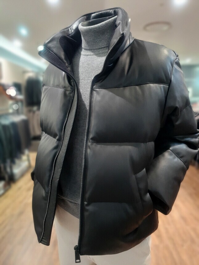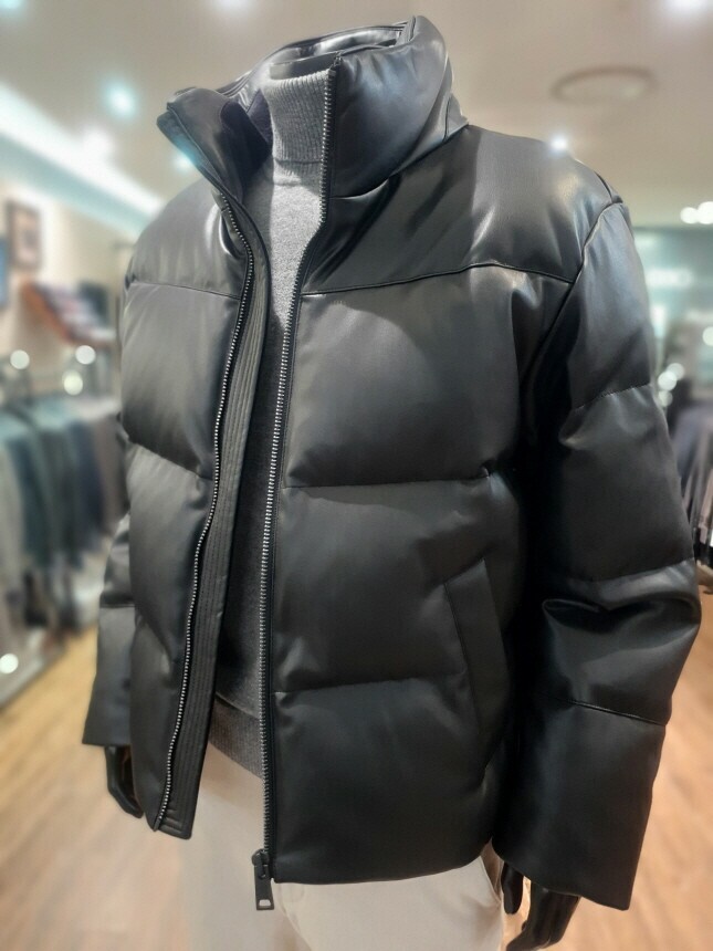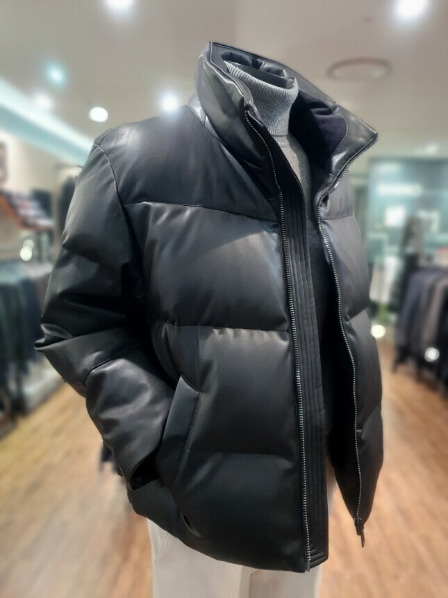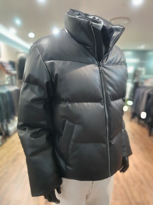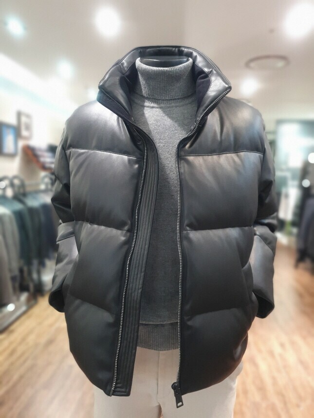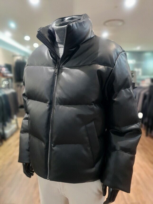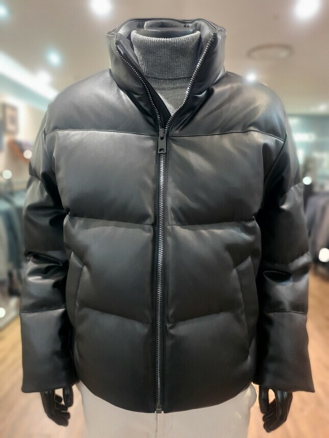 [바쏘옴므] 24년F/W 블랙 하이넥 프리미엄 덕다운 인조가죽 숏패딩 점퍼
