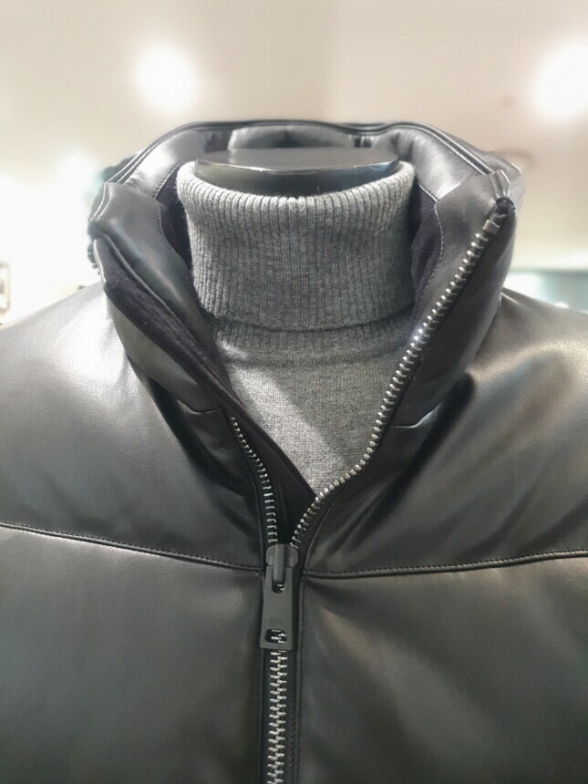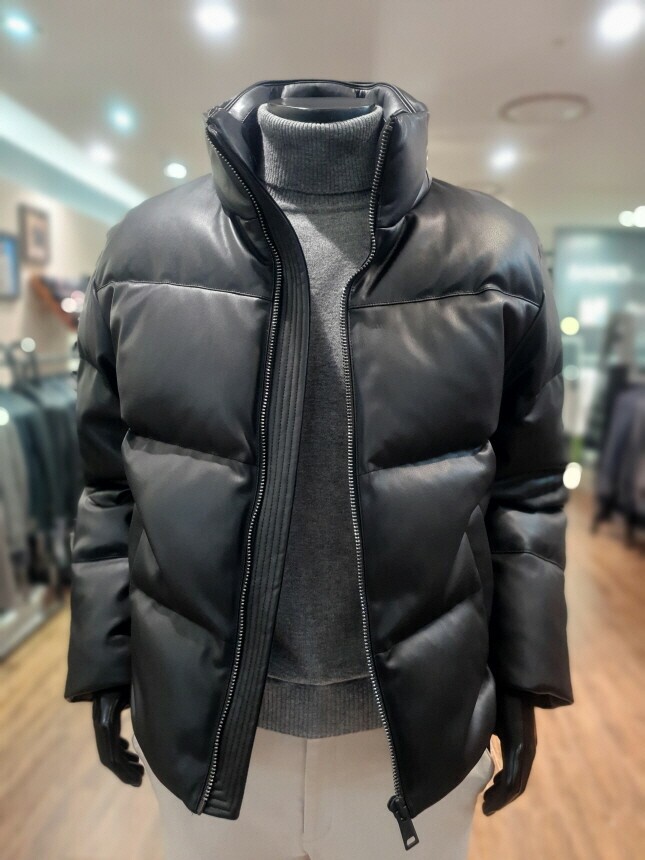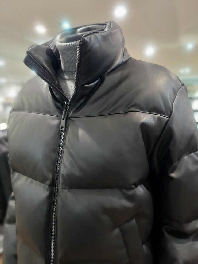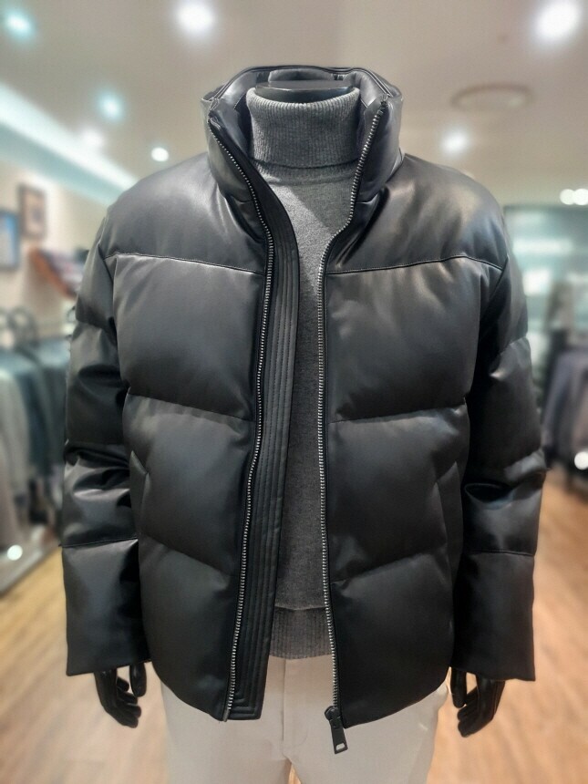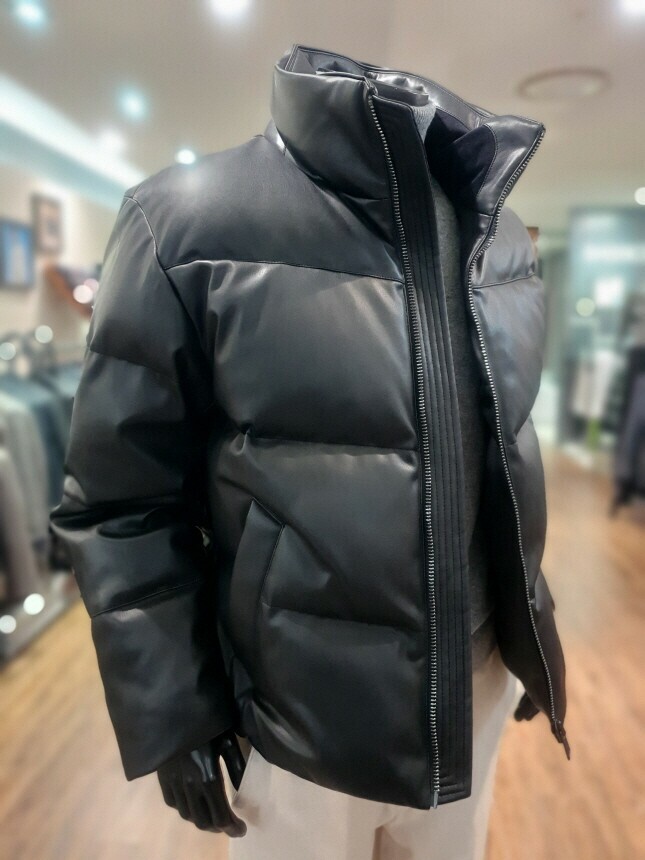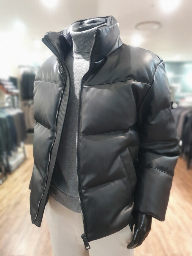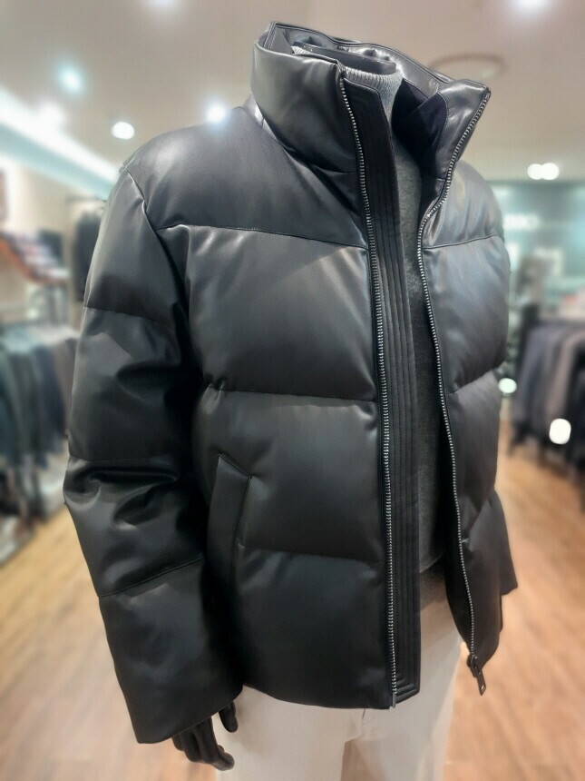 [바쏘옴므] 24년F/W 블랙 하이넥 프리미엄 덕다운 인조가죽 숏패딩 점퍼