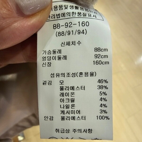 | 1. 제품 소재 (섬유의 조성 또는 혼용률을 백분율로 표시, 기능성인 경우 성적서 또는 허가서) | 겉감 모 46% 폴리에스터 38% 레이온 5% 아크릴 4% 나일론 4% 캐시미어 3% / 안감 폴리에스터 100% |