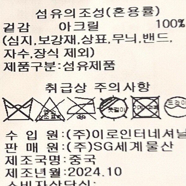 1. 제품 소재 (섬유의 조성 또는 혼용률을 백분율로 표시, 기능성인 경우 성적서 또는 허가서) 겉감-아크릴100%