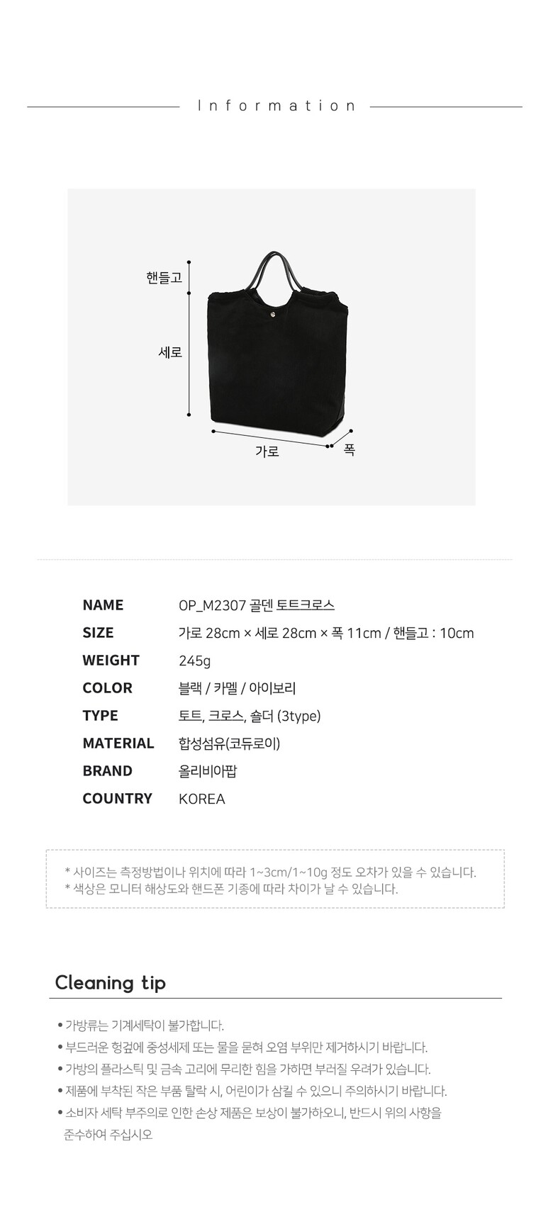 레네 여성 가을 겨울 골덴 코듀로이 토트백 가방 L92368