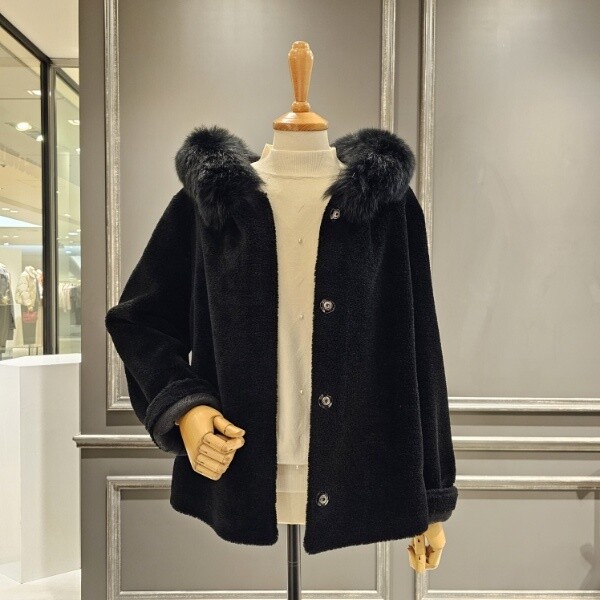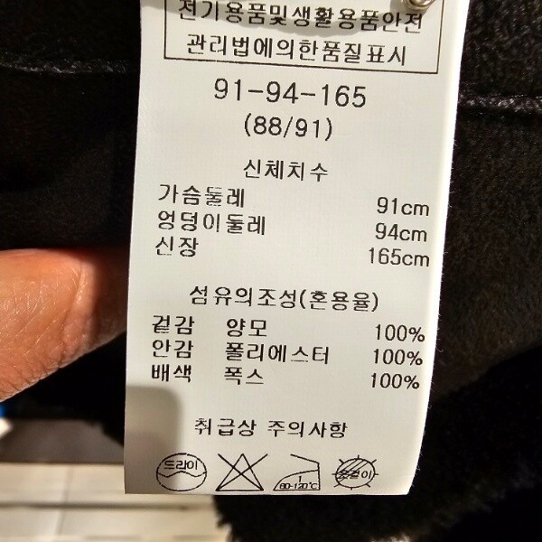 | 1. 제품 소재 (섬유의 조성 또는 혼용률을 백분율로 표시, 기능성인 경우 성적서 또는 허가서) | 겉감 양모 100% / 안감 폴리에스터 100% / 배색 폭스 퍼 100% |