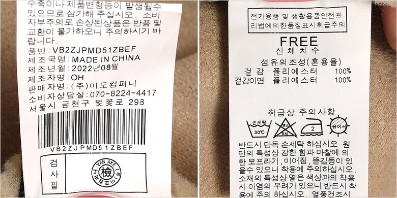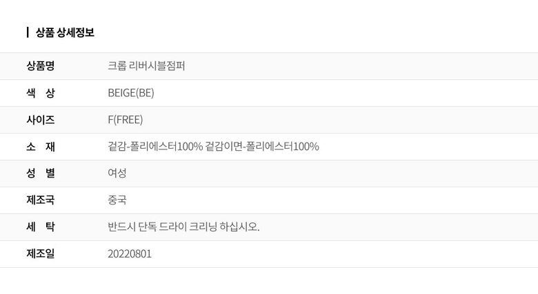 | 1. 제품 소재 (섬유의 조성 또는 혼용률을 백분율로 표시, 기능성인 경우 성적서 또는 허가서) | 겉감-폴리에스터100% 겉감이면-폴리에스터100% |