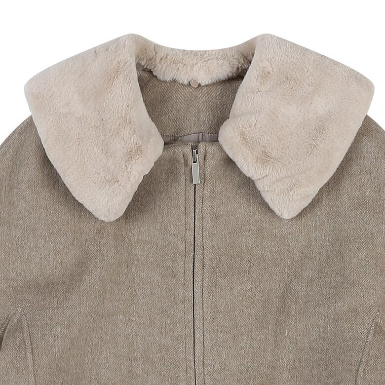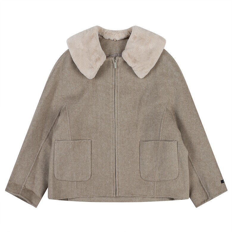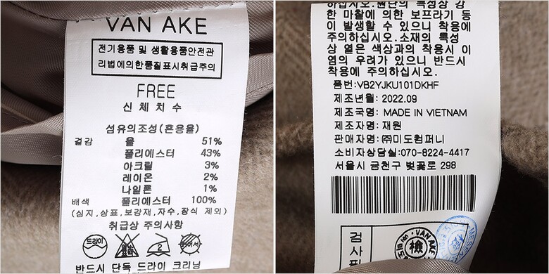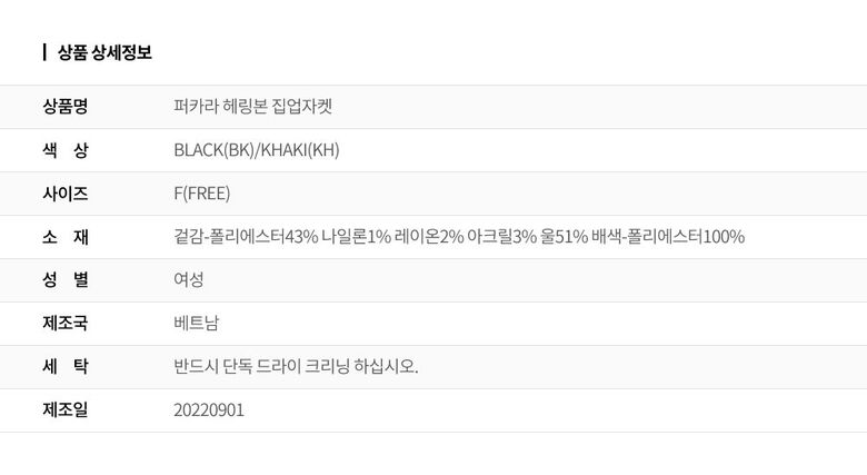 1. 제품 소재 (섬유의 조성 또는 혼용률을 백분율로 표시, 기능성인 경우 성적서 또는 허가서) 겉감-폴리에스터43% 나일론1% 레이온2% 아크릴3% 울51% 배색-폴리에스터100%