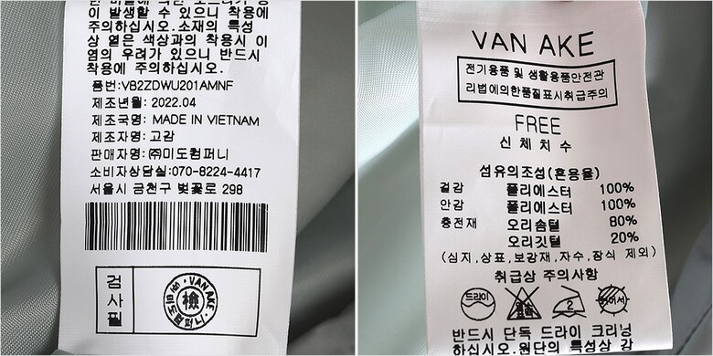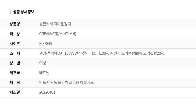 | 1. 제품 소재 (섬유의 조성 또는 혼용률을 백분율로 표시, 기능성인 경우 성적서 또는 허가서) | 겉감-폴리에스터100% 안감-폴리에스터100% 충전재:오리솜털80% 오리깃털20% |