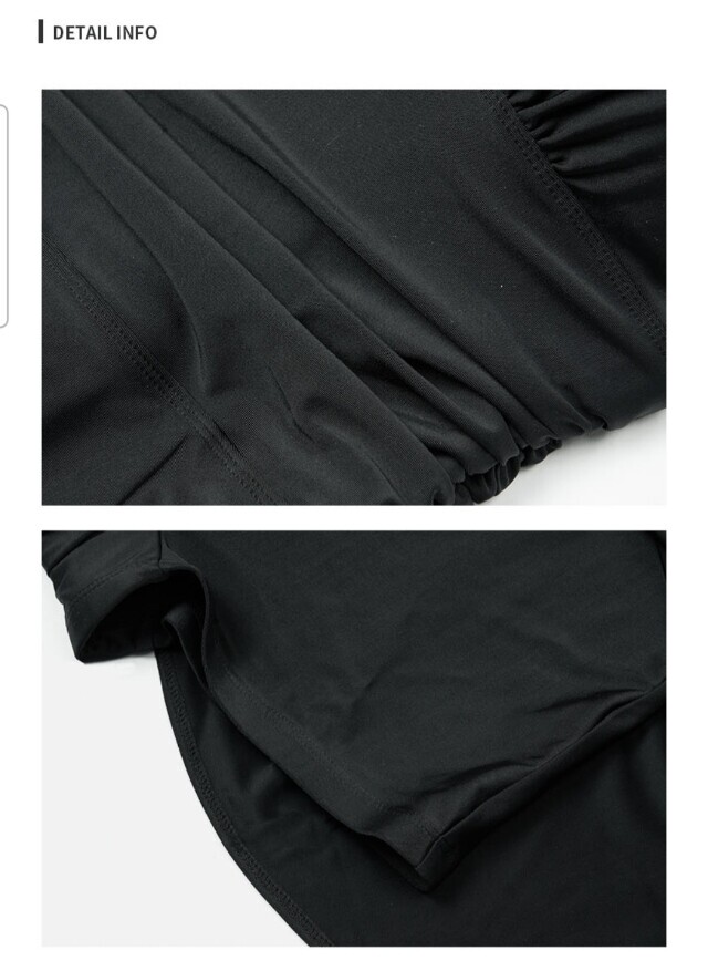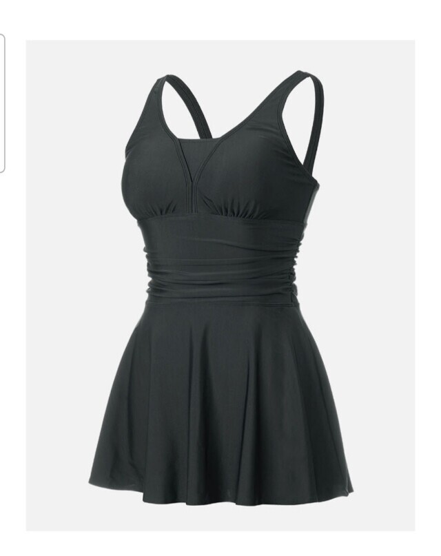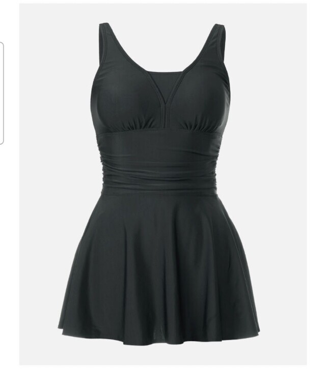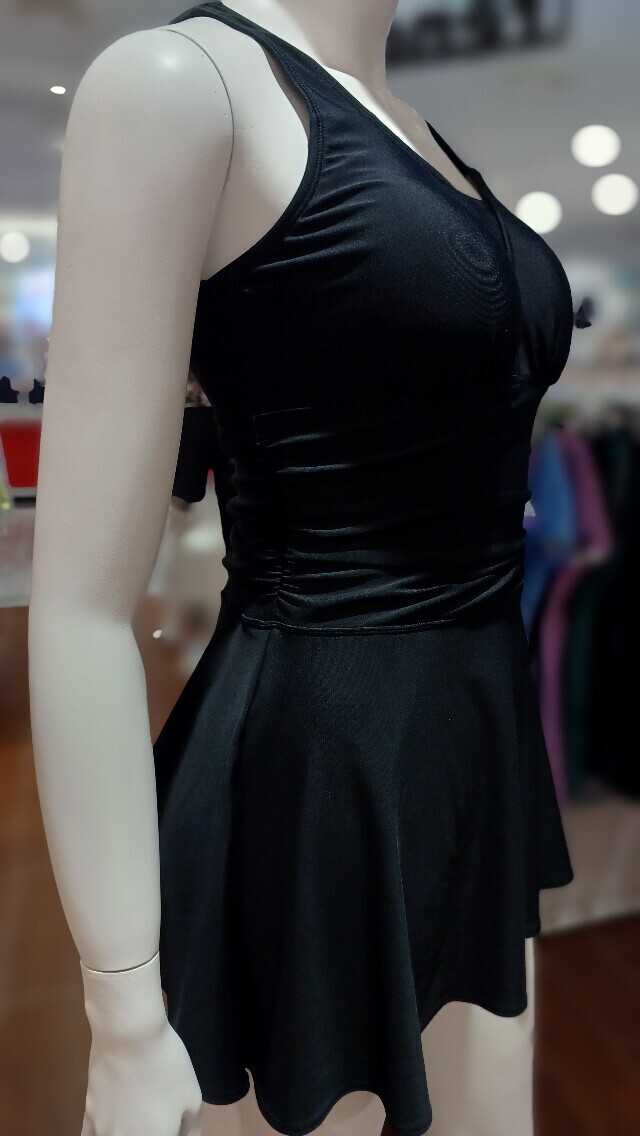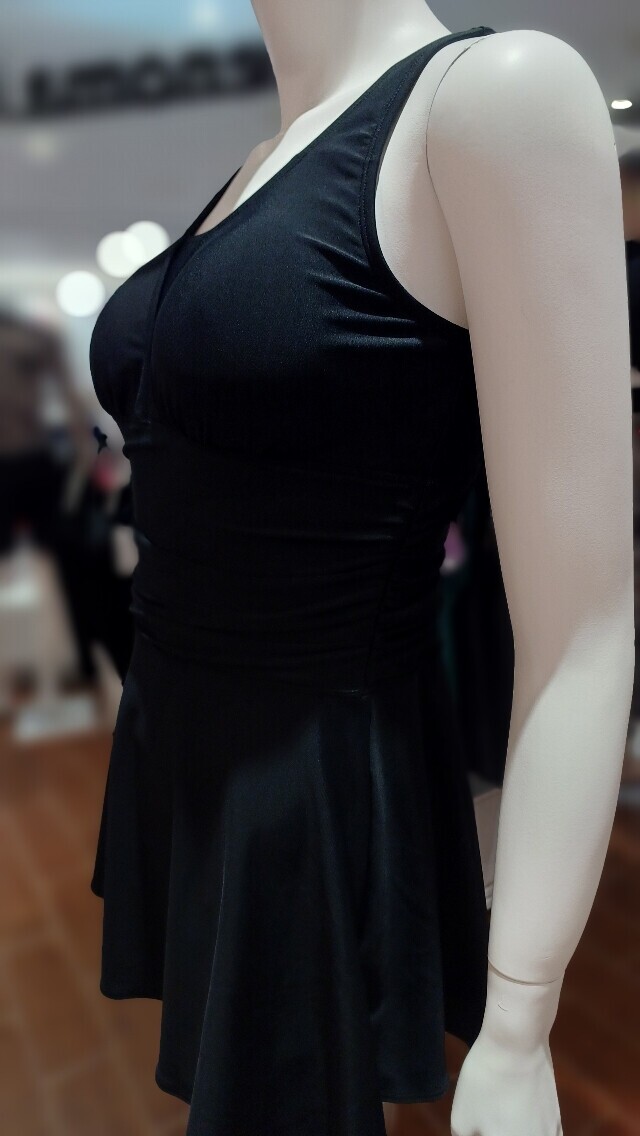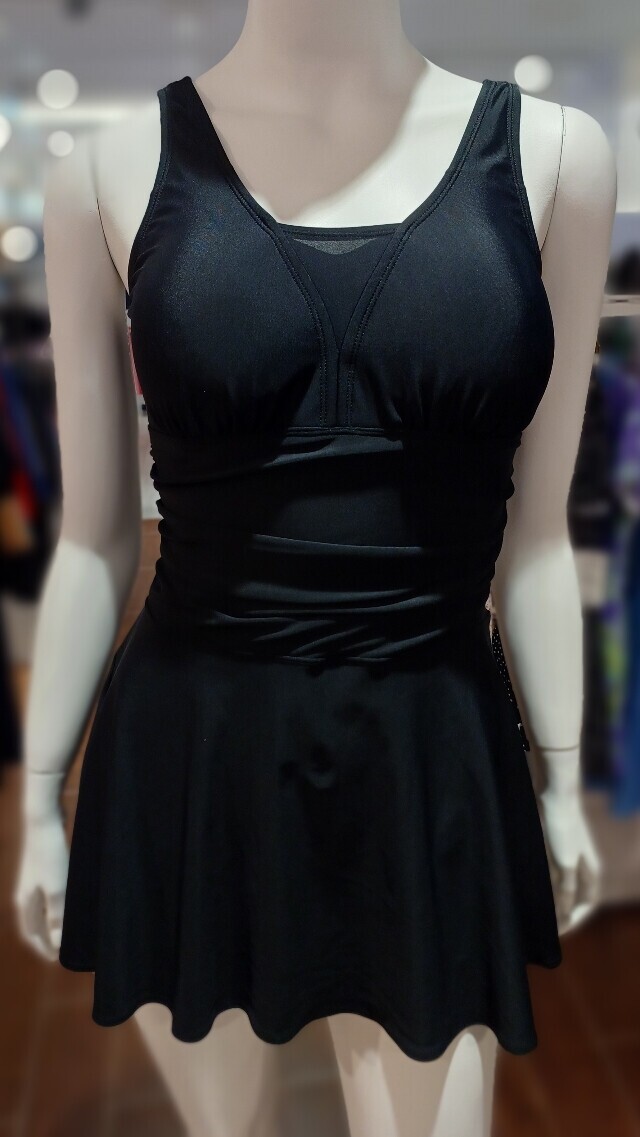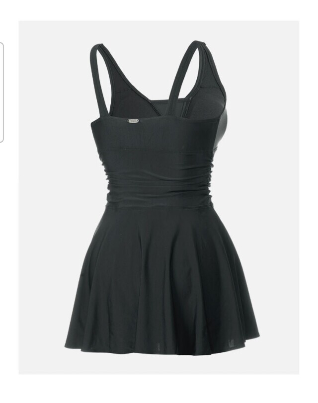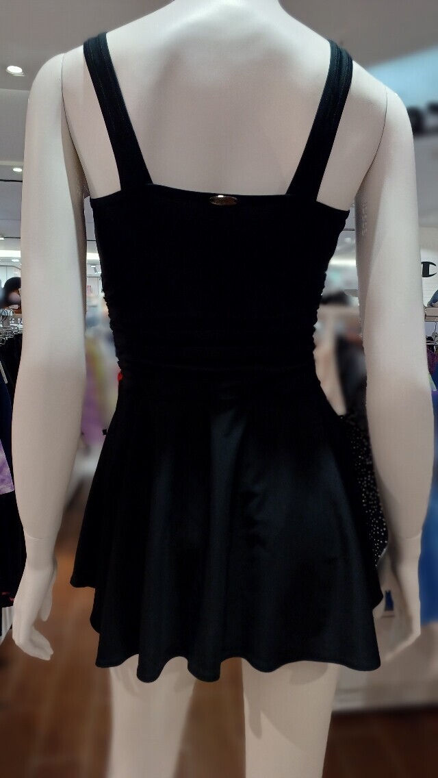 깔끔한 블랙 컬러에 허리라인 셔링 부분이 날씬해 보이며 레깅스 팬츠에 스커트가 일체형으로 착용하기 편한 원피스 수영복입니다.