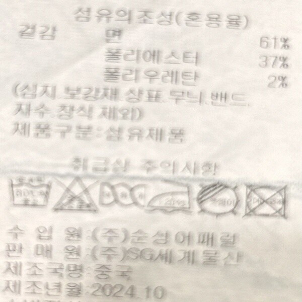 제품소재 : 겉감-면61%, 폴리에스터37%, 폴리우레탄2%