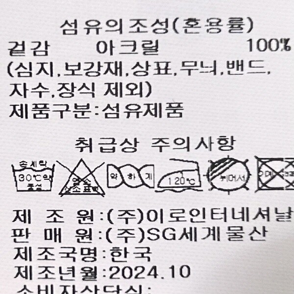 1. 제품 소재 (섬유의 조성 또는 혼용률을 백분율로 표시, 기능성인 경우 성적서 또는 허가서) | 겉감-아크릴100% |