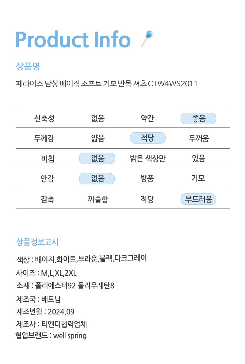 | 1. 제품 소재 (섬유의 조성 또는 혼용률을 백분율로 표시, 기능성인 경우 성적서 또는 허가서) | 상세설명참고 |