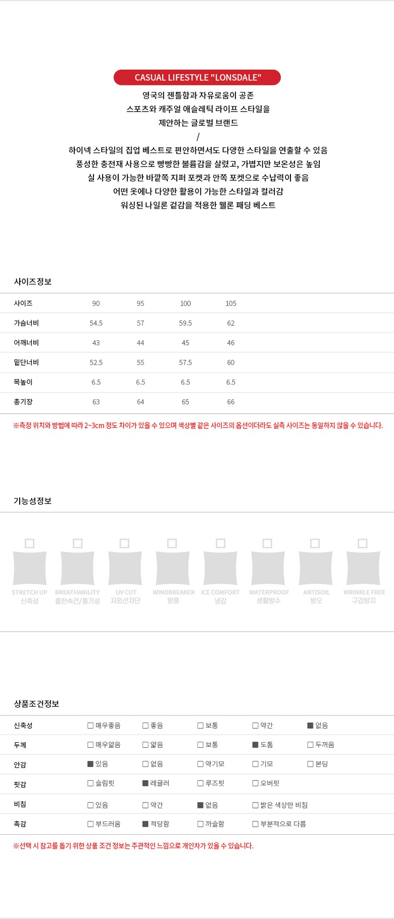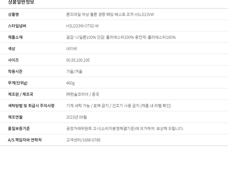 | 1. 제품 소재 (섬유의 조성 또는 혼용률을 백분율로 표시, 기능성인 경우 성적서 또는 허가서) | 상세설명참고 |