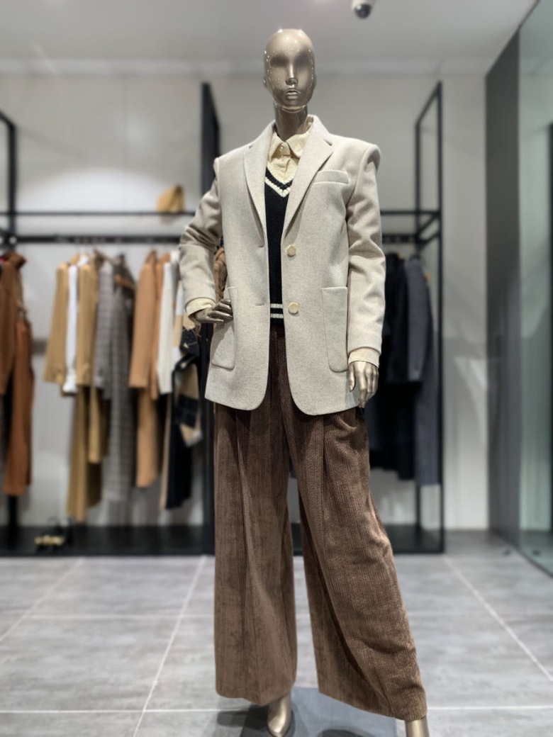 | 1. 제품 소재 (섬유의 조성 또는 혼용률을 백분율로 표시, 기능성인 경우 성적서 또는 허가서) | 겉감:폴리에스테르 80%, 울 20% / 배색:울 50%, 폴리에스테르 50% |