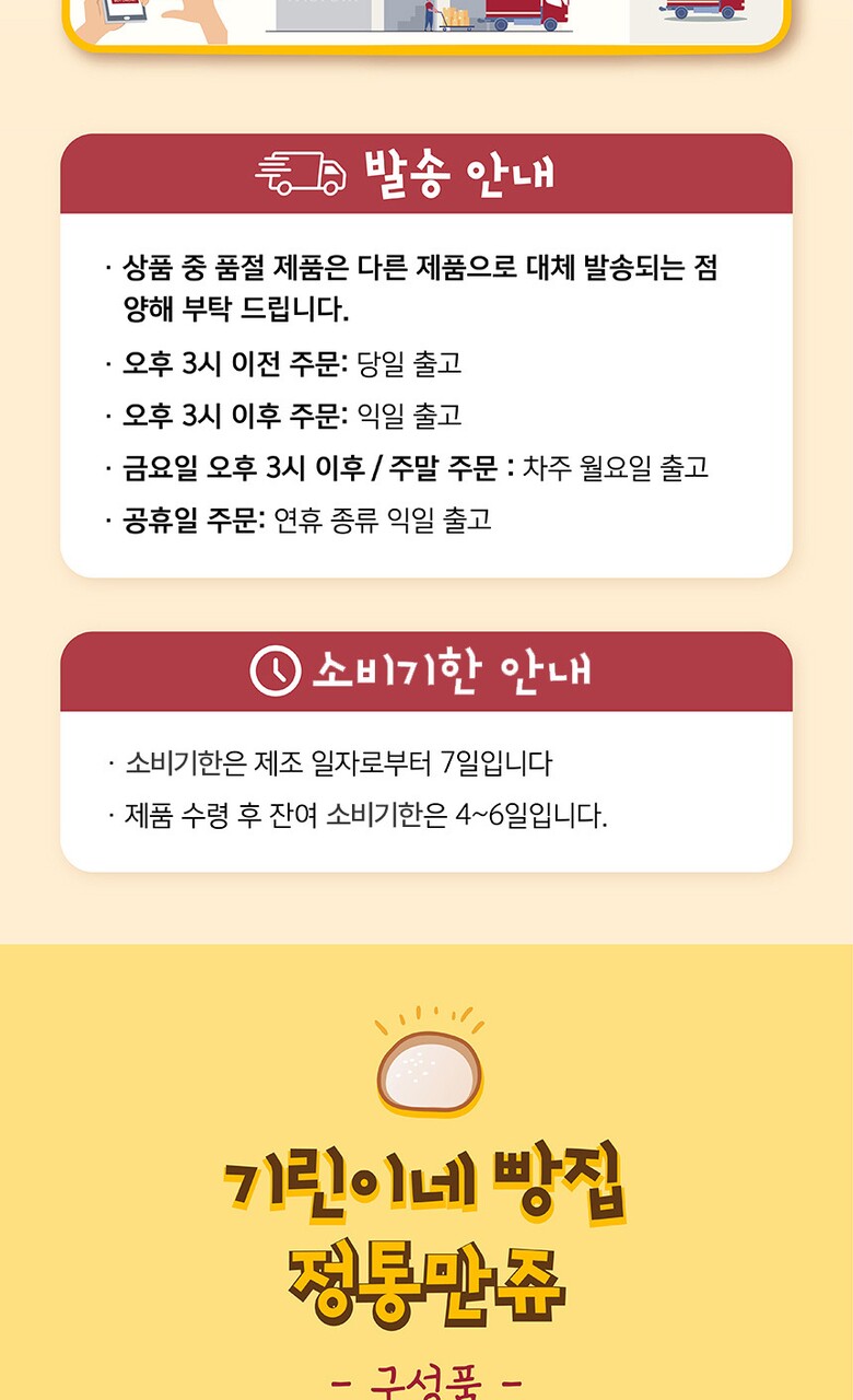4. 생산일자,유통기한 | 1.냉장:상시제조/소비기한은 제조 일자로부터 7일 입니다. 2.실온/냉동 제조연월일 :상시 제조 상품으로 잔여 소비기한이 3분의 1이상인 제품으로 출고되고 있으며, 소비 기한이 비교적 짧은 제품은 최소 13달이상 남은 제품으로 출고됩니다. |