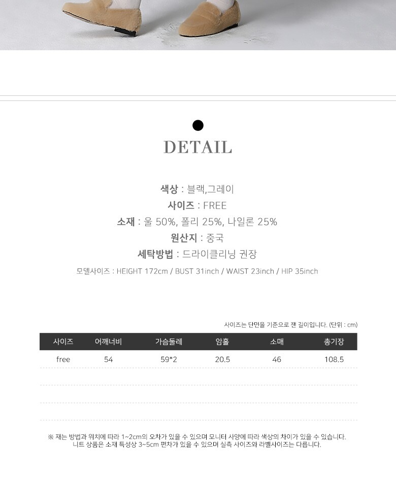 | 1. 제품 소재 (섬유의 조성 또는 혼용률을 백분율로 표시, 기능성인 경우 성적서 또는 허가서) | 울 50%, 폴리 25%, 나일론 25% |