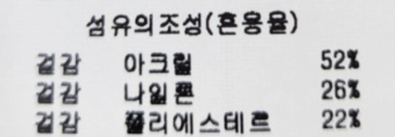 1. 제품 소재 (섬유의 조성 또는 혼용률을 백분율로 표시, 기능성인 경우 성적서 또는 허가서) 겉감:아크릴 52%, 나일론 26%, 폴리에스테르 22%, 레이스