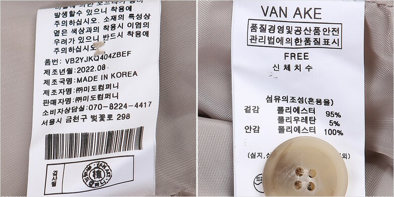 | 1. 제품 소재 (섬유의 조성 또는 혼용률을 백분율로 표시, 기능성인 경우 성적서 또는 허가서) | 겉감-폴리에스터95% 폴리우레탄5% 안감-폴리에스터100% |