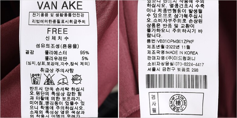 1. 제품 소재 (섬유의 조성 또는 혼용률을 백분율로 표시, 기능성인 경우 성적서 또는 허가서) 겉감-폴리에스터95% 폴리우레탄5%